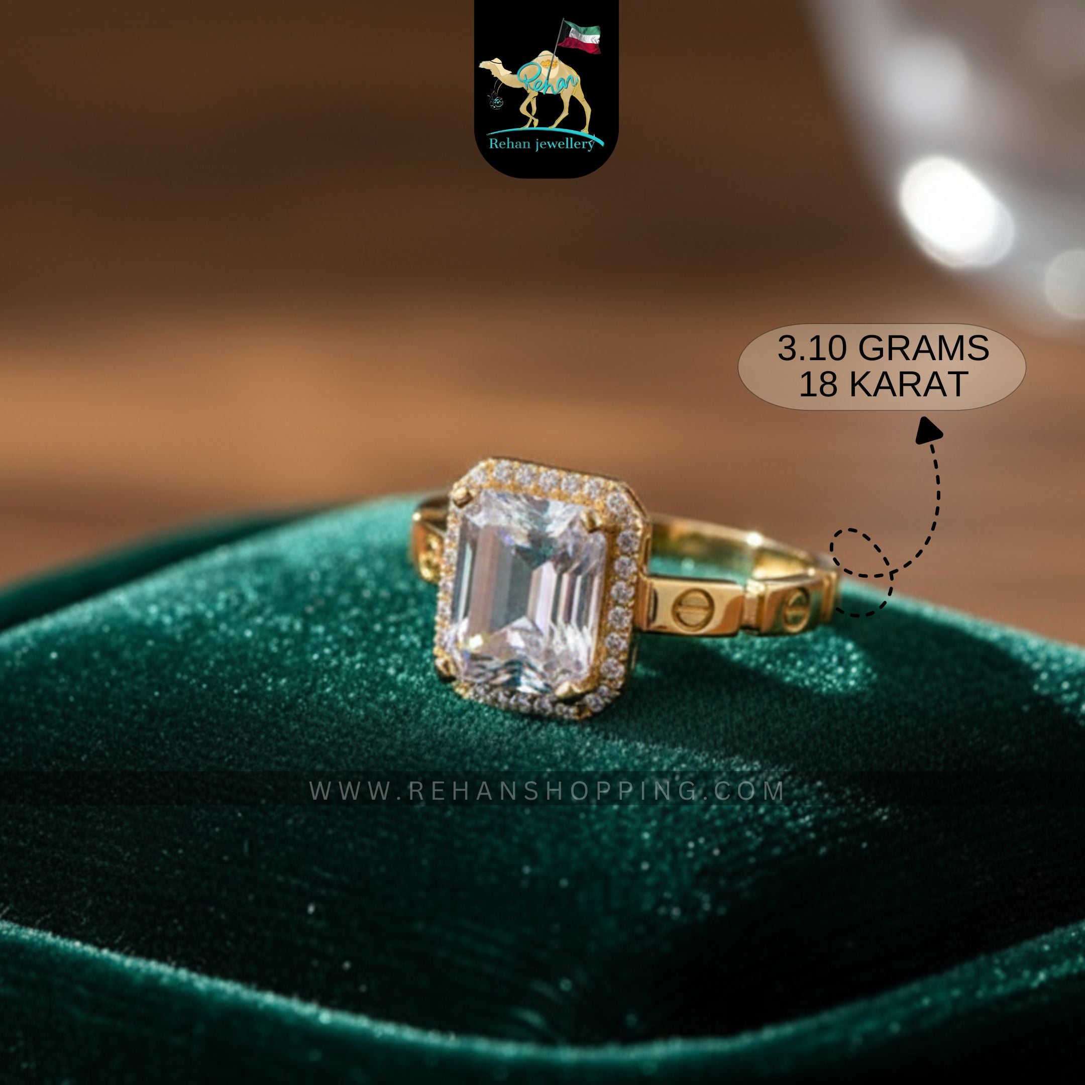 Elevate your elegance with this 18 Karat Gold Emerald-Cut Solitaire Ring by Rehan Jewellery. Weighing 3.10 grams of pure 18K gold, this masterpiece showcases a radiant emerald-cut stone surrounded by a halo of sparkling accents, set on a bold engraved gold band. Perfect for engagements, anniversaries, weddings, or as a timeless statement ring, this design blends modern craftsmanship with classic sophistication.