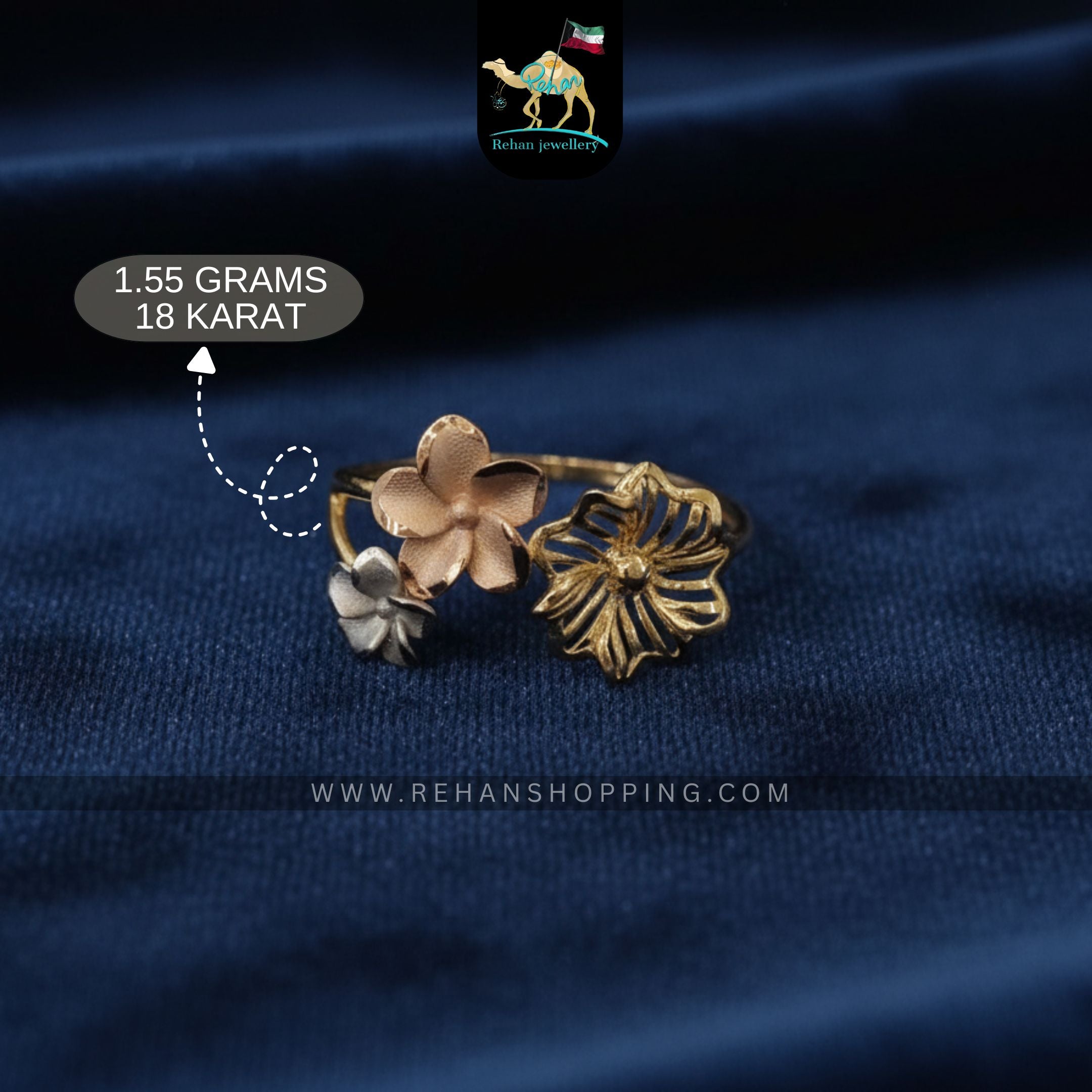 18K Gold Floral Tri-Tone Ring – 1.55 Grams | Elegant Three-Flower Design | Rehan Jewellery