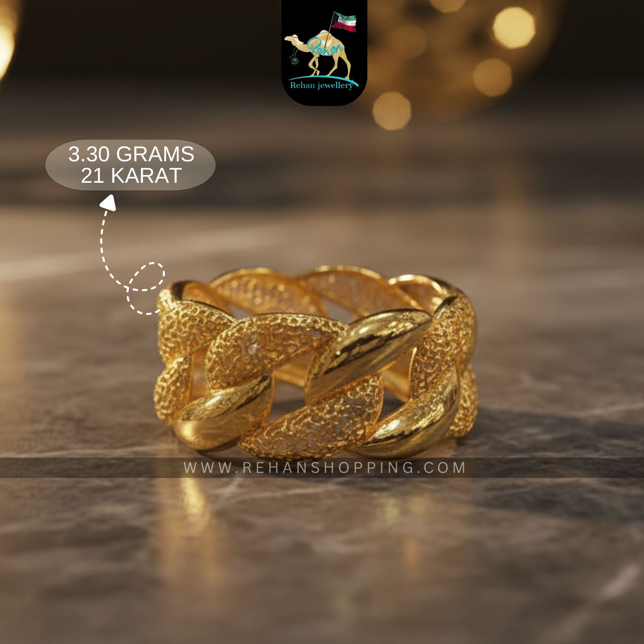 Elevate your style with this 21K Gold Chain-Link Ring, weighing 3.30 grams. Designed with an intricate interlocking link pattern, this piece represents strength, unity, and sophistication. Its polished and textured finish adds depth and brilliance — making it a perfect statement ring for both men and women. Handcrafted by Rehan Jewellery, this luxurious design blends classic craftsmanship with modern elegance.