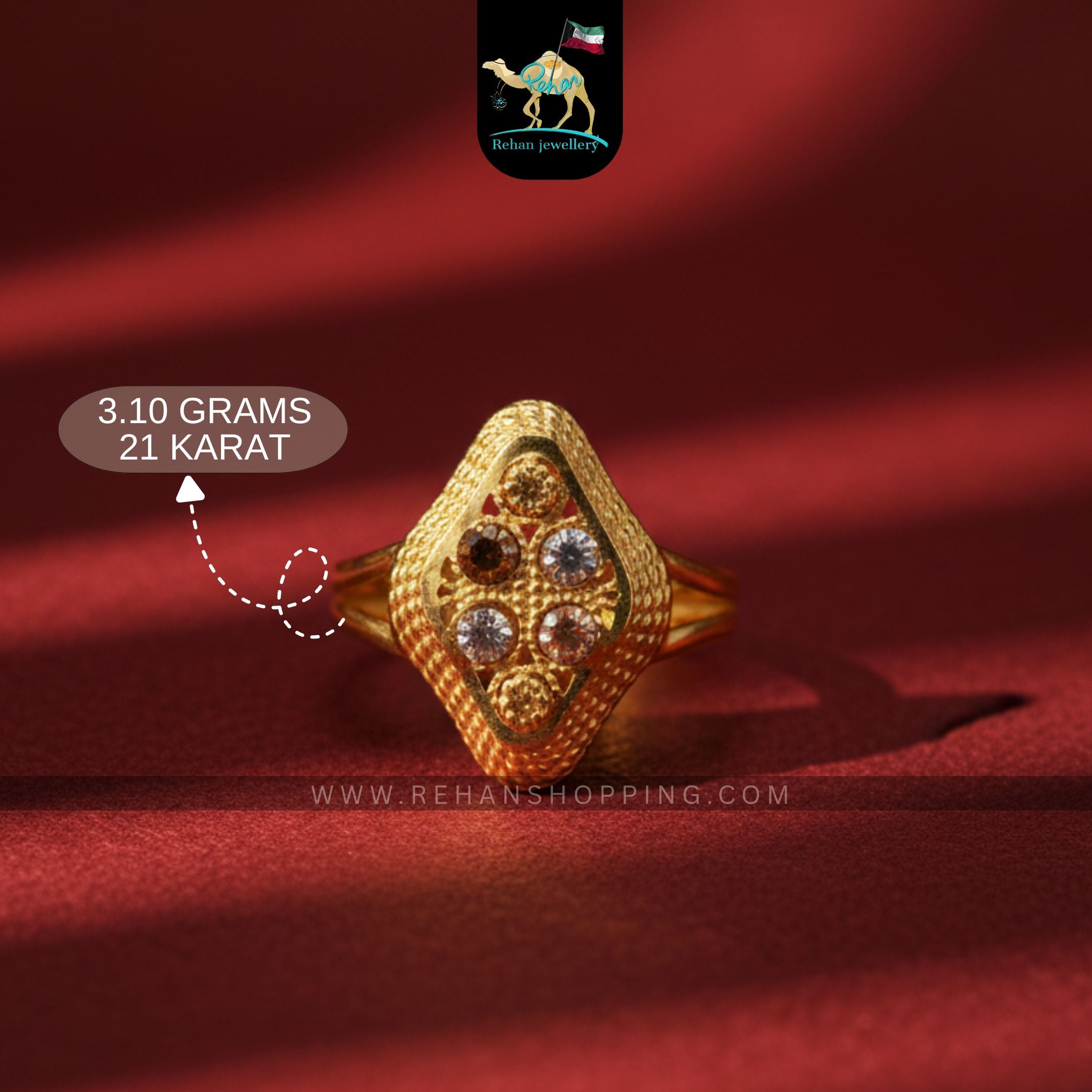 Add timeless charm to your look with this 21K Gold Diamond-Pattern Ring, weighing 3.10 grams. Designed with a vintage geometric shape adorned with sparkling stone accents, this handcrafted piece captures both tradition and modern elegance. Made from pure 21K gold, it’s perfect for weddings, celebrations, or as a luxurious daily accessory.