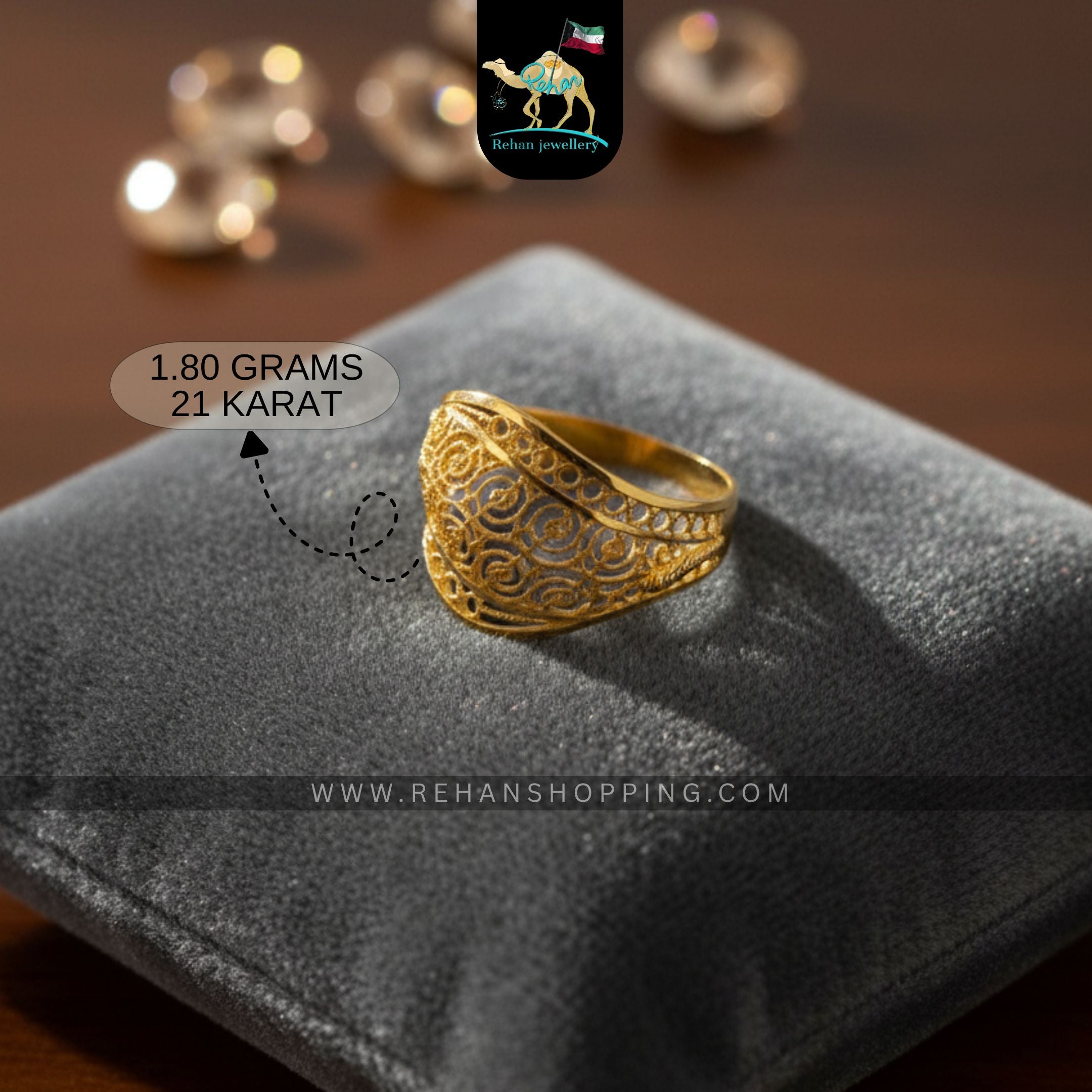 Grace your hands with this 21K Gold Filigree Ring, weighing 1.80 grams. Crafted with intricate lace-style detailing, this piece showcases traditional artistry with a modern touch. Its lightweight and elegant pattern make it a perfect choice for daily wear, gifting, or adding sophistication to any look. Designed for women who appreciate timeless elegance in every detail.