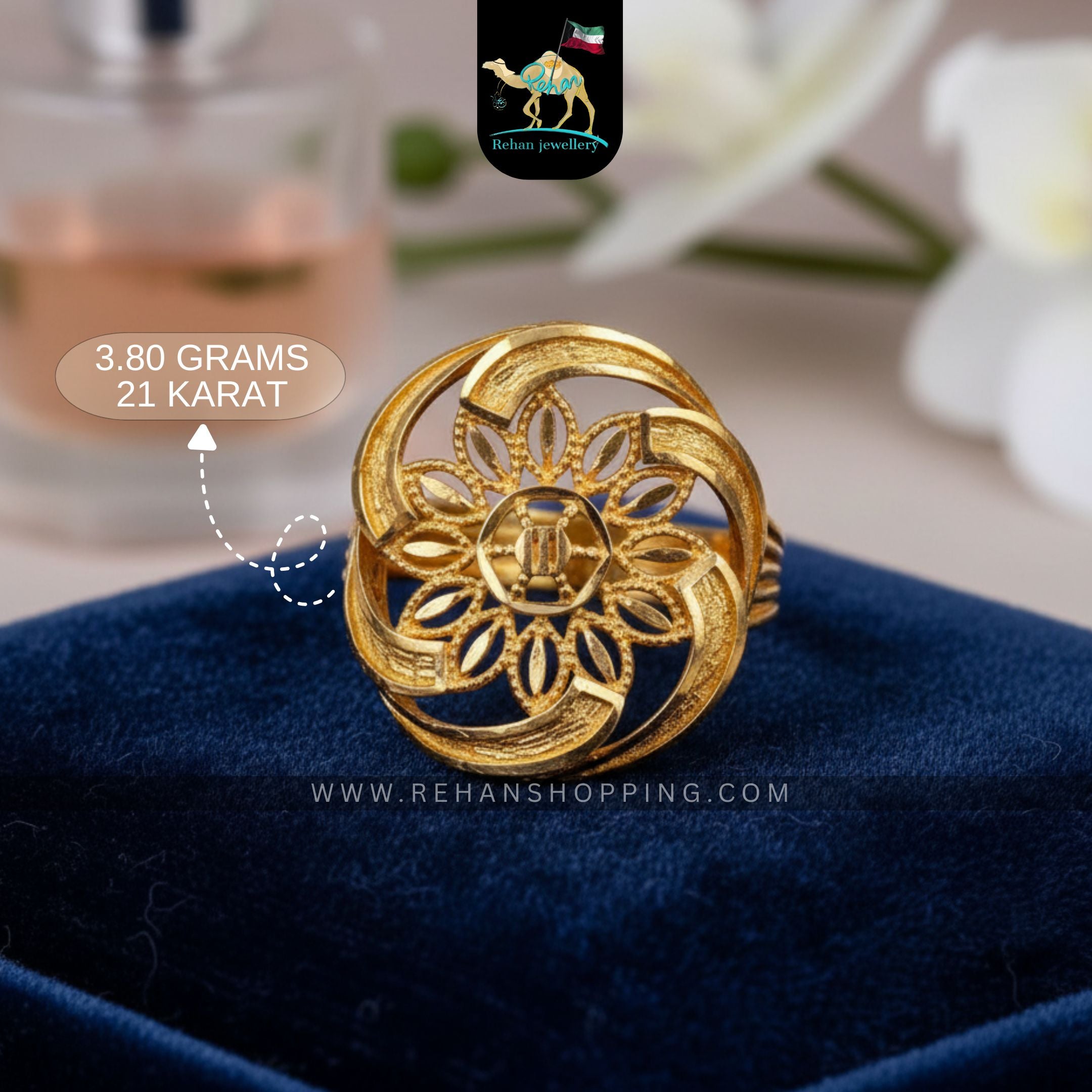 Enhance your elegance with this stunning 21K Gold Floral Round Ring, weighing 3.80 grams. Featuring a delicate petal-inspired pattern in a circular motif, this ring captures the timeless beauty of nature in pure gold. Its intricate craftsmanship and polished finish make it the perfect statement piece for both everyday wear and special occasions. Handcrafted by Rehan Jewellery, this floral design symbolizes grace, luxury, and femininity.