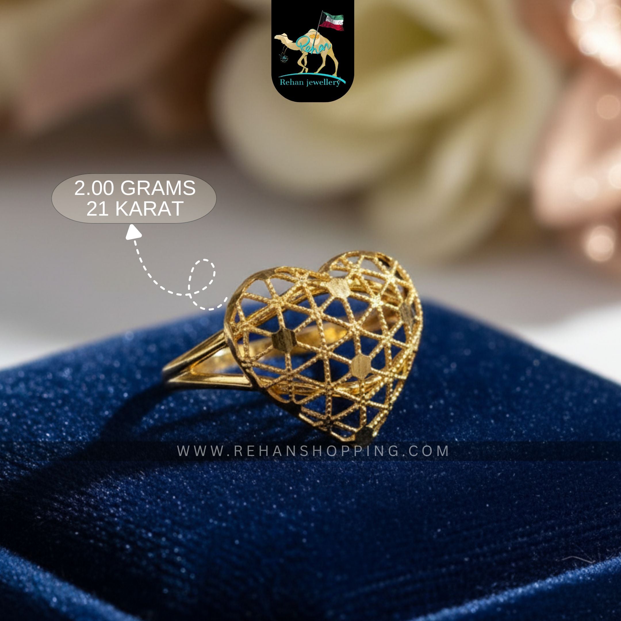 Express timeless love and luxury with this 21K Gold Geometric Heart Ring, weighing 2.00 grams. Featuring an intricate open lattice heart design, this ring blends classic romance with modern craftsmanship. Its lightweight structure and elegant detailing make it perfect for daily wear, gifting, or celebrating special occasions. Handcrafted with precision to highlight the brilliance of pure 21K gold.