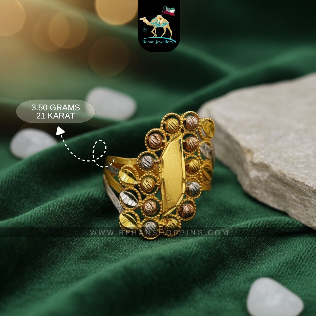 Add timeless charm to your jewellery collection with this 21 Karat Gold Multi-Tone Statement Ring from Rehan Jewellery. Weighing 3.50 grams, this elegant ring features a unique handcrafted design with intricate circular and floral patterns in yellow, rose, and white gold tones. Its detailed finish and bold style make it the perfect piece for weddings, parties, or everyday luxury wear.