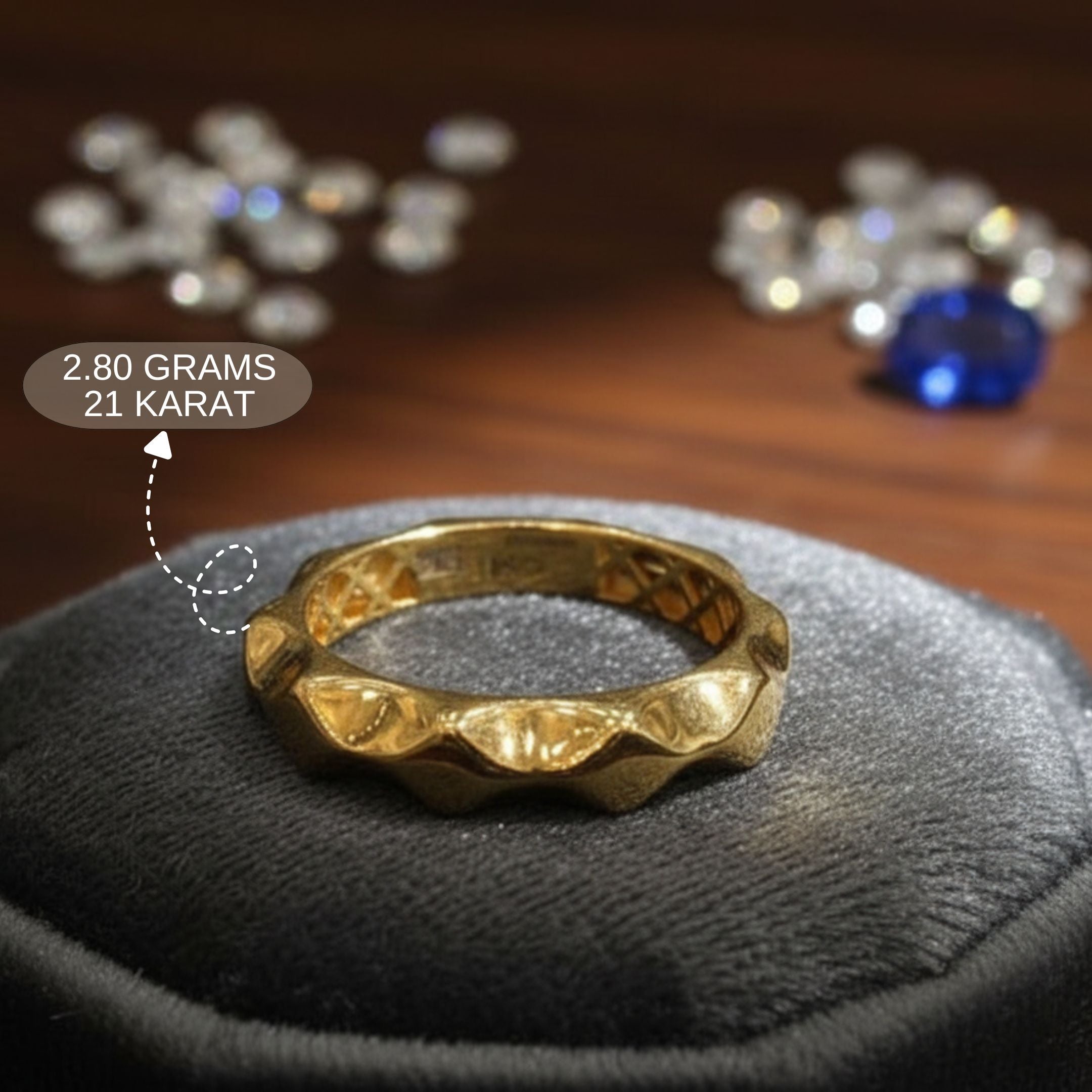 Add a touch of refined luxury with this 21K Gold Textured Band Ring, weighing 2.80 grams. Featuring a bold geometric wave-cut design with a lustrous polished finish, this ring offers a perfect balance of sophistication and simplicity. Ideal for everyday wear or special occasions, it showcases expert craftsmanship and the timeless beauty of pure 21-karat gold. Designed with precision by Rehan Jewellery, this piece elevates any look with its understated elegance.
