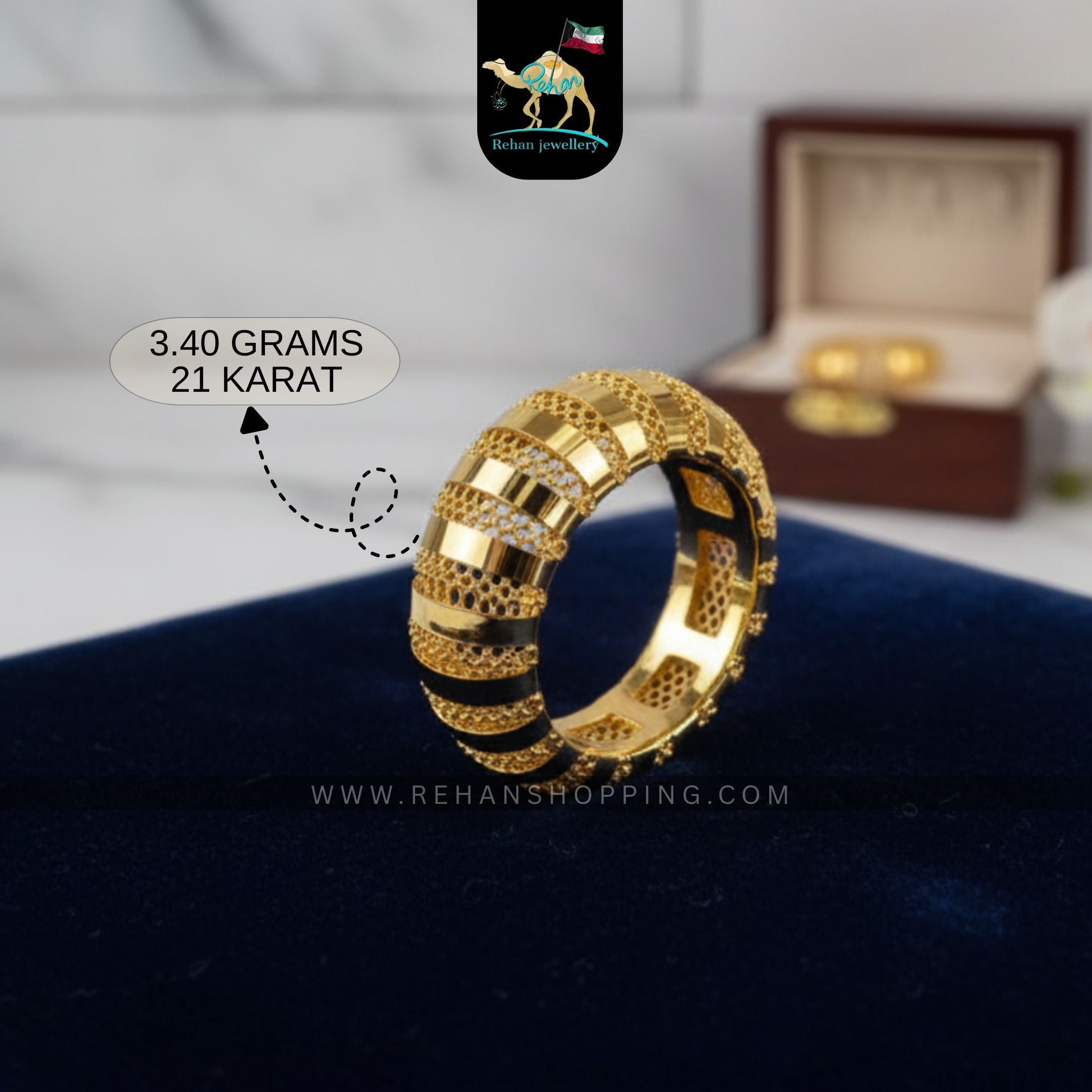 Make a bold statement with this 21K Gold Textured Band Ring, weighing 3.40 grams. Crafted with precision, it features alternating polished and diamond-cut textured stripes that reflect light beautifully from every angle. Its contemporary design combines luxury with durability, making it perfect for both men and women who appreciate refined craftsmanship.