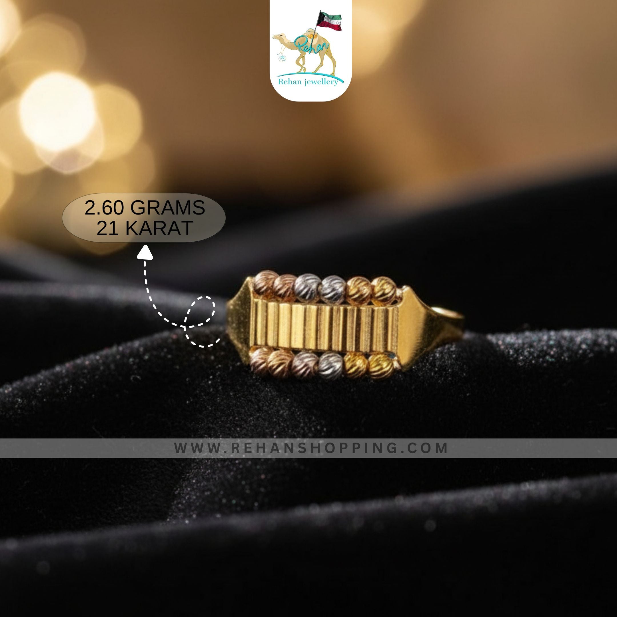 Add a touch of sophistication to your collection with this 21K Gold Tri-Tone Beaded Ring, weighing 2.60 grams. Beautifully crafted with intricate golden, silver, and rose-gold beads, this design blends artistry with timeless elegance. Perfect for any occasion, this lightweight yet eye-catching ring enhances both modern and traditional styles. Expertly handcrafted by Rehan Jewellery, it reflects purity, luxury, and fine detail.