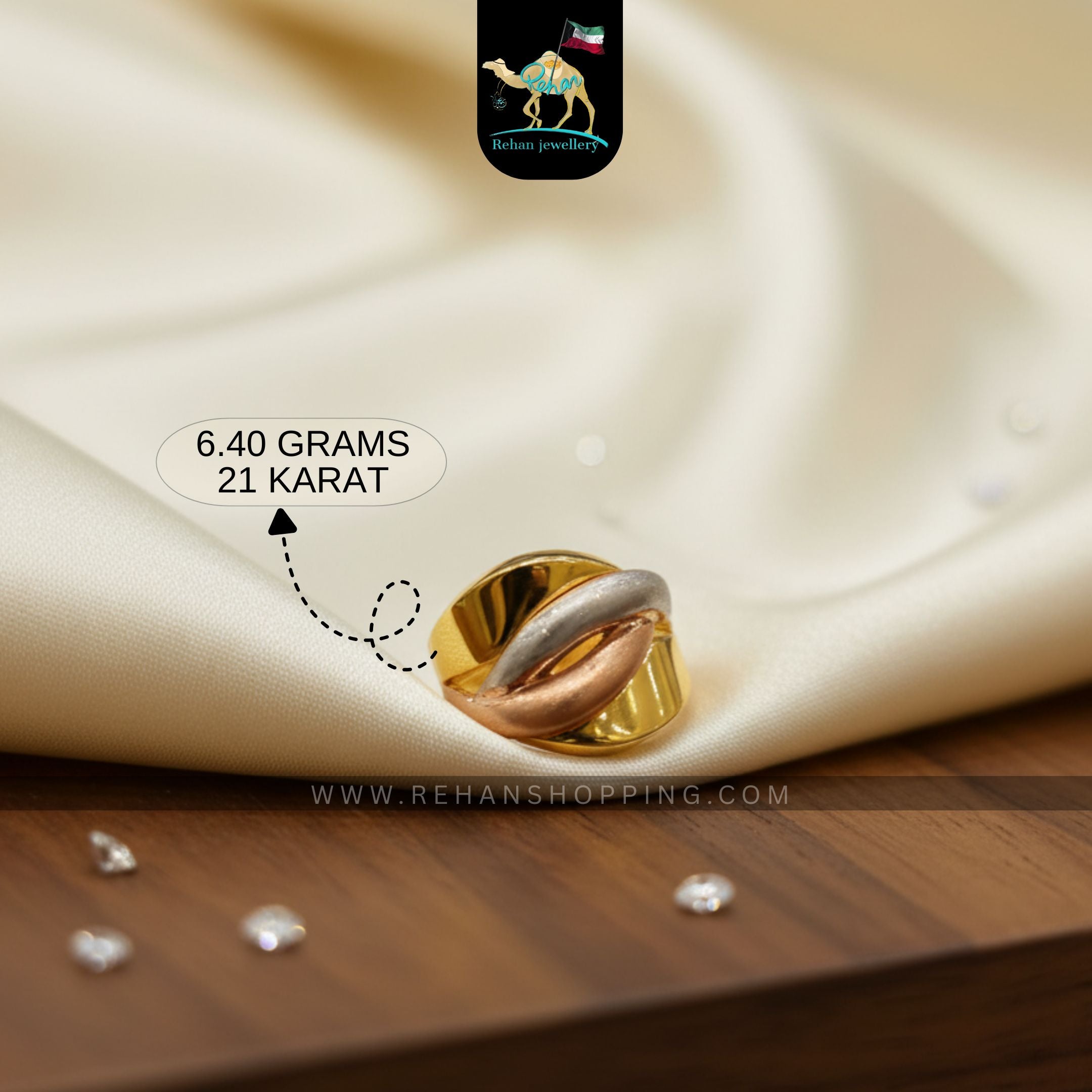 Experience the perfect blend of artistry and elegance with this 21K Gold Tri-Tone Statement Ring from Rehan Jewellery Kuwait.