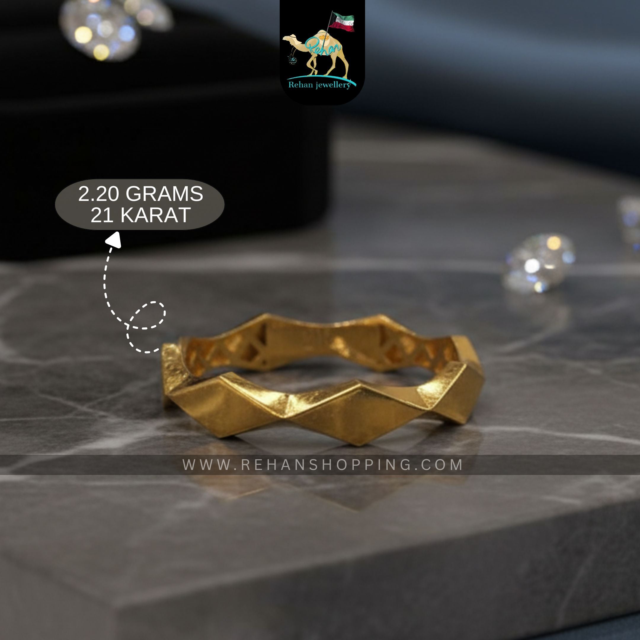 Embrace modern sophistication with this 21K Gold Zigzag Band Ring, weighing 2.20 grams. Designed with a sleek geometric zigzag pattern, this ring reflects contemporary style blended with timeless gold craftsmanship. Its bold yet minimal design makes it perfect for both daily wear and special occasions. Handcrafted by Rehan Jewellery, this piece captures the essence of elegance and individuality in every angle.