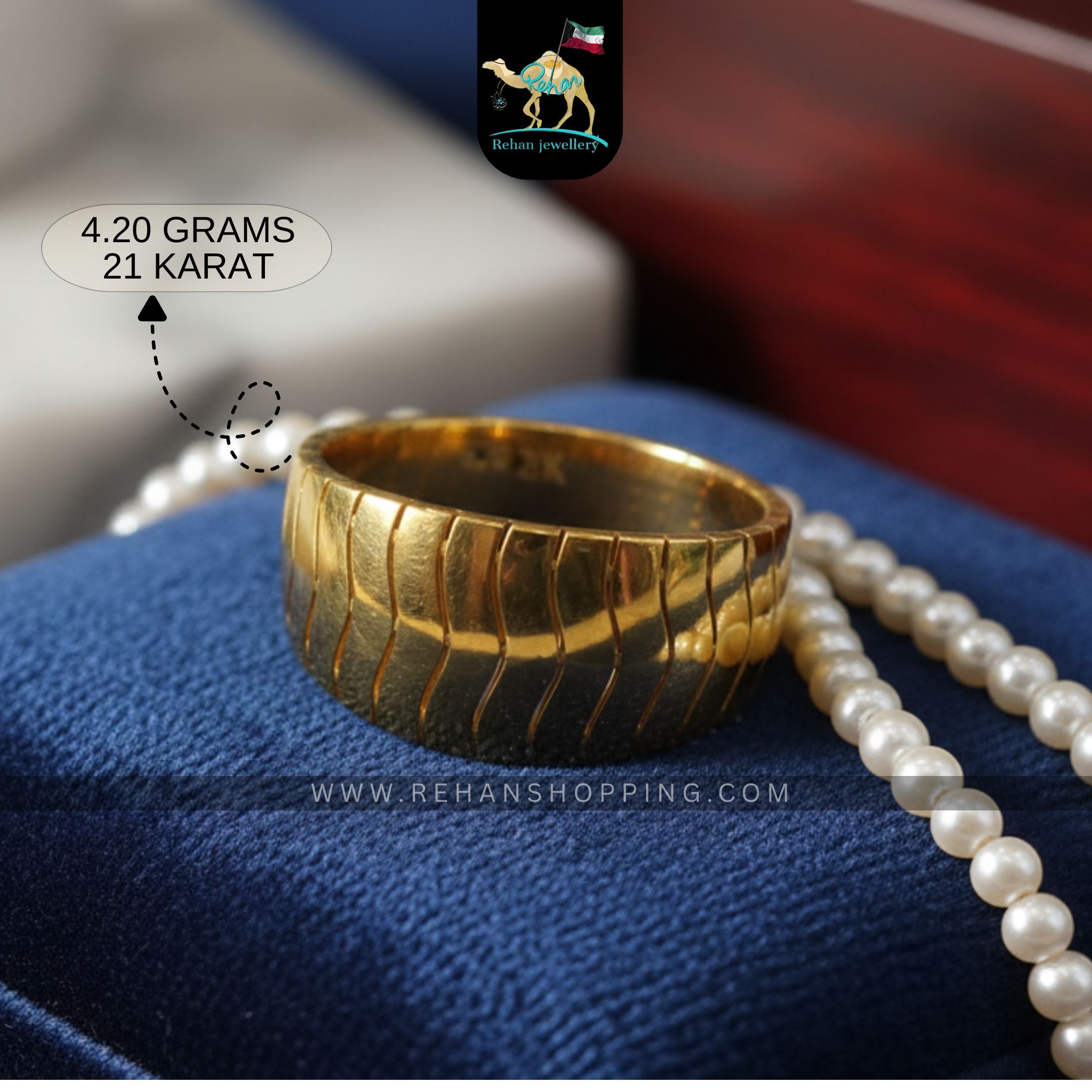 Experience the beauty of refined craftsmanship with this 21K Gold Textured Band Ring, weighing 4.20 grams. Its bold and elegant wide-band design features delicate vertical wave engravings that reflect light beautifully. Crafted with precision by Rehan Jewellery, this statement ring embodies sophistication, durability, and timeless luxury — perfect for both men and women who appreciate authentic gold artistry.