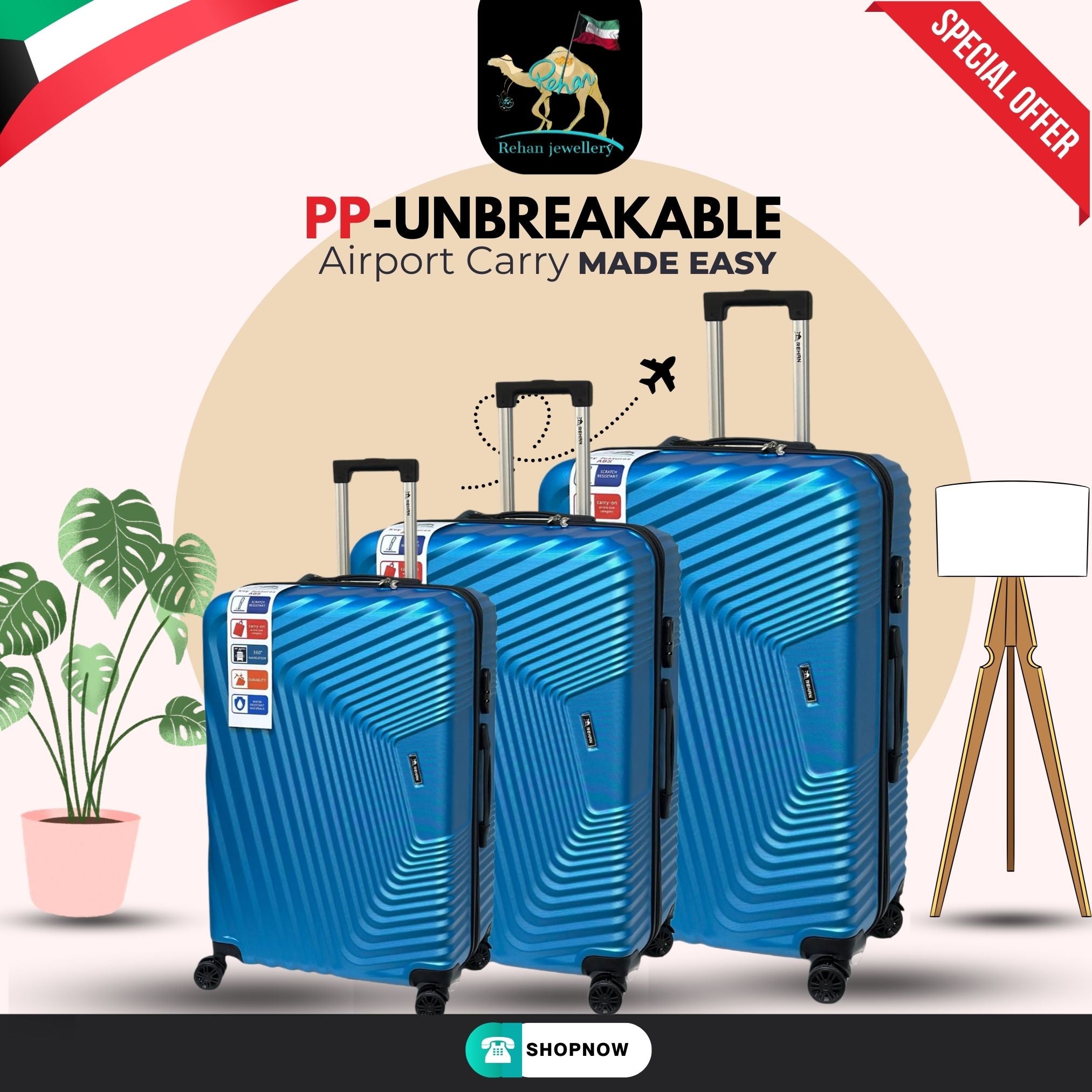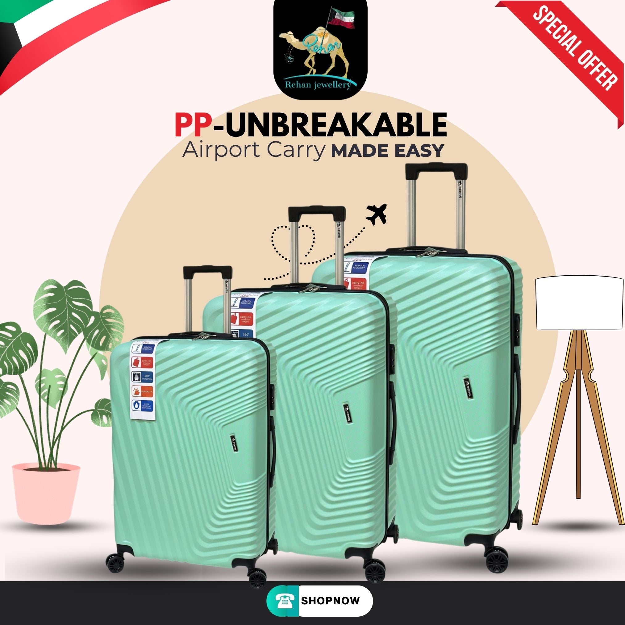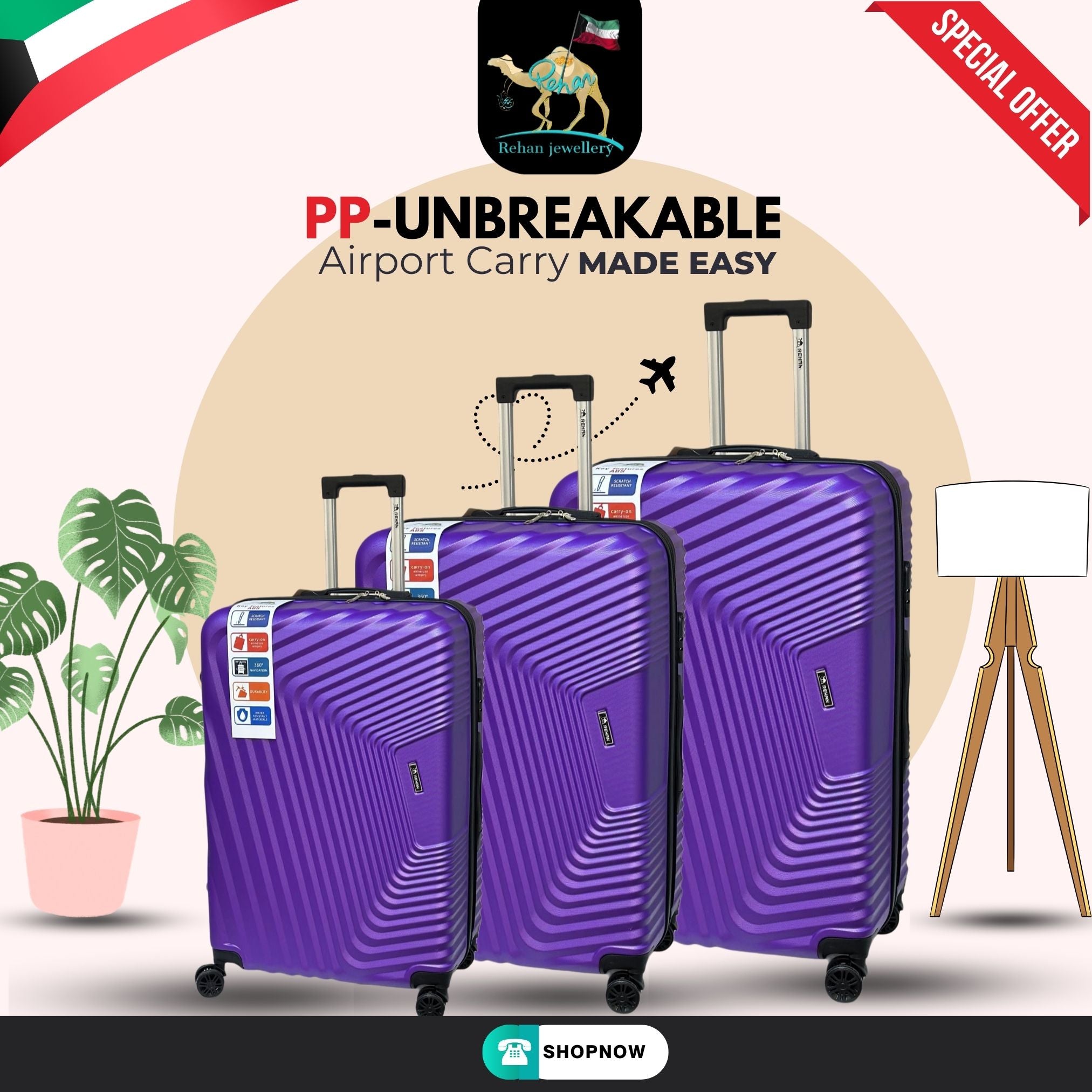 Travel smarter with our 3 Pcs PP Trolley Bag Set, built with an unbreakable polypropylene hard shell, 360° smooth spinner wheels, and reinforced zippers for durability. Lightweight, stylish, and spacious – the perfect luggage set for business trips, vacations, and family travel in Kuwait.