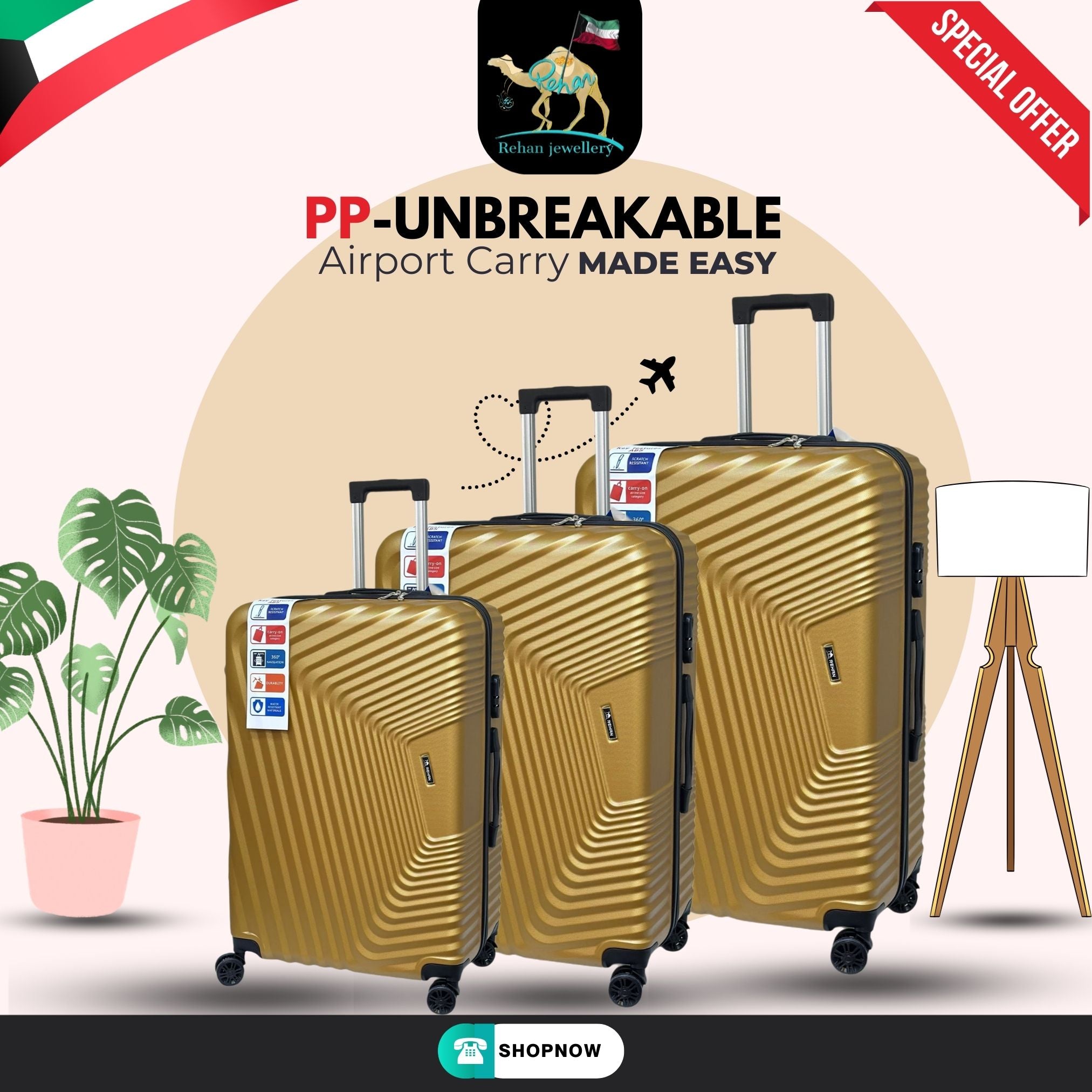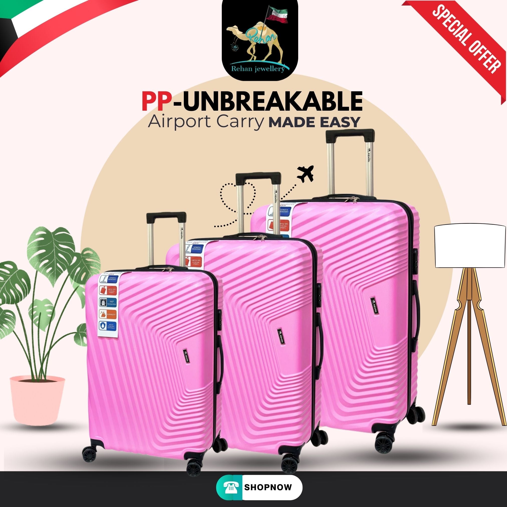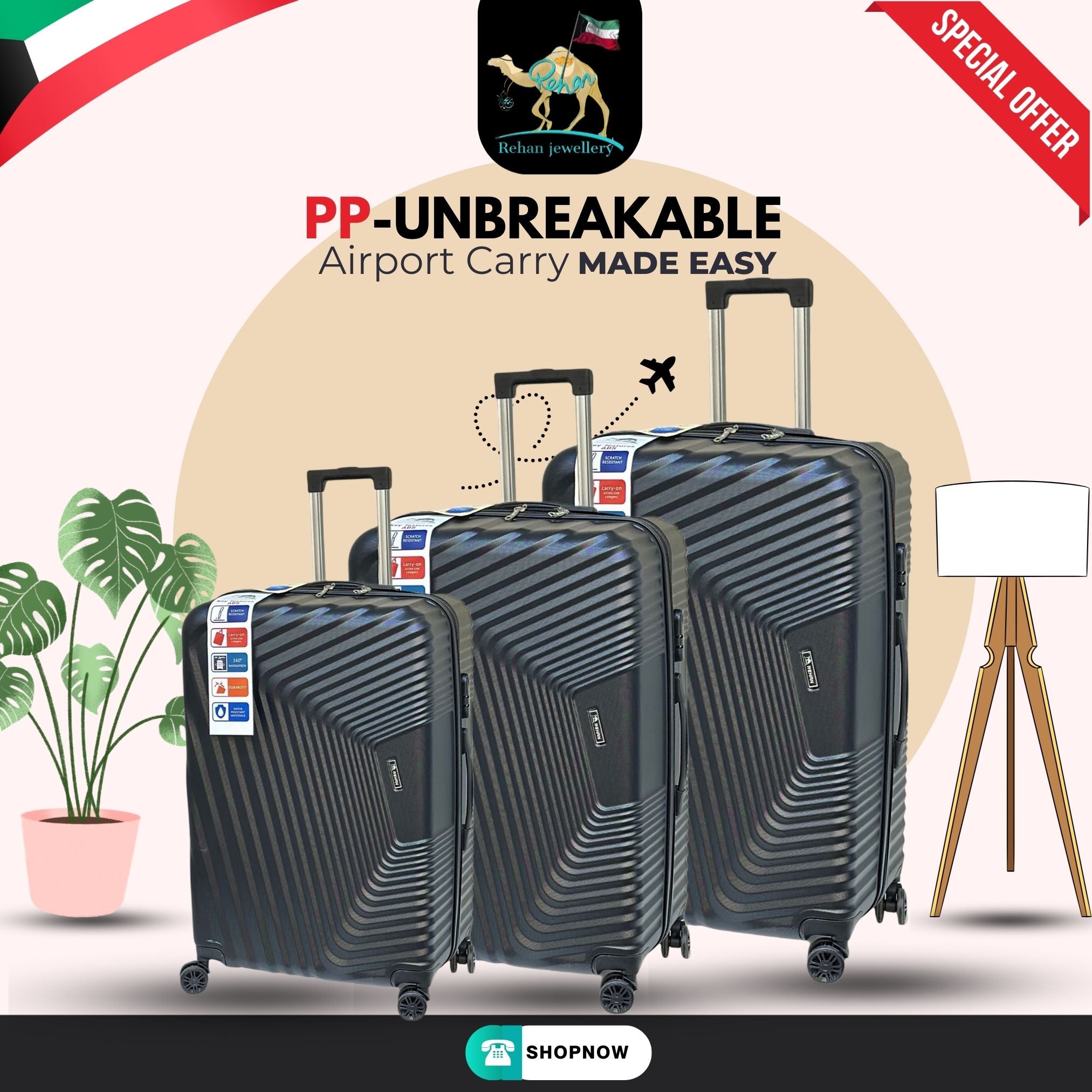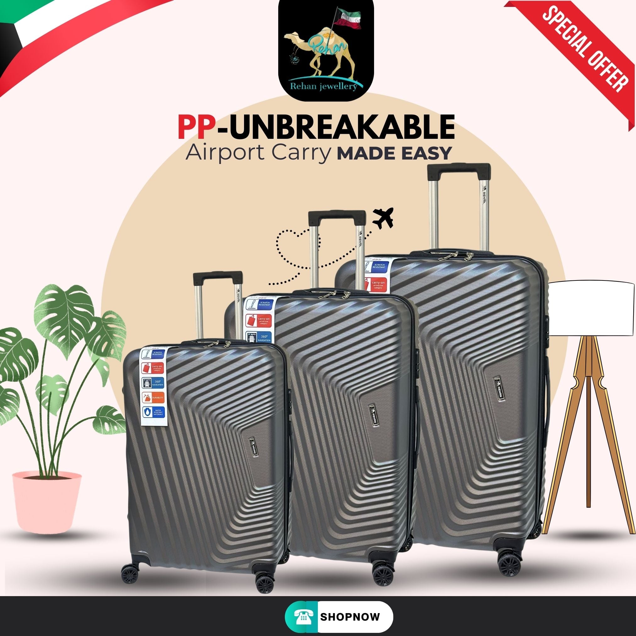 Travel smarter with our 3 Pcs PP Trolley Bag Set, built with an unbreakable polypropylene hard shell, 360° smooth spinner wheels, and reinforced zippers for durability. Lightweight, stylish, and spacious – the perfect luggage set for business trips, vacations, and family travel in Kuwait.
