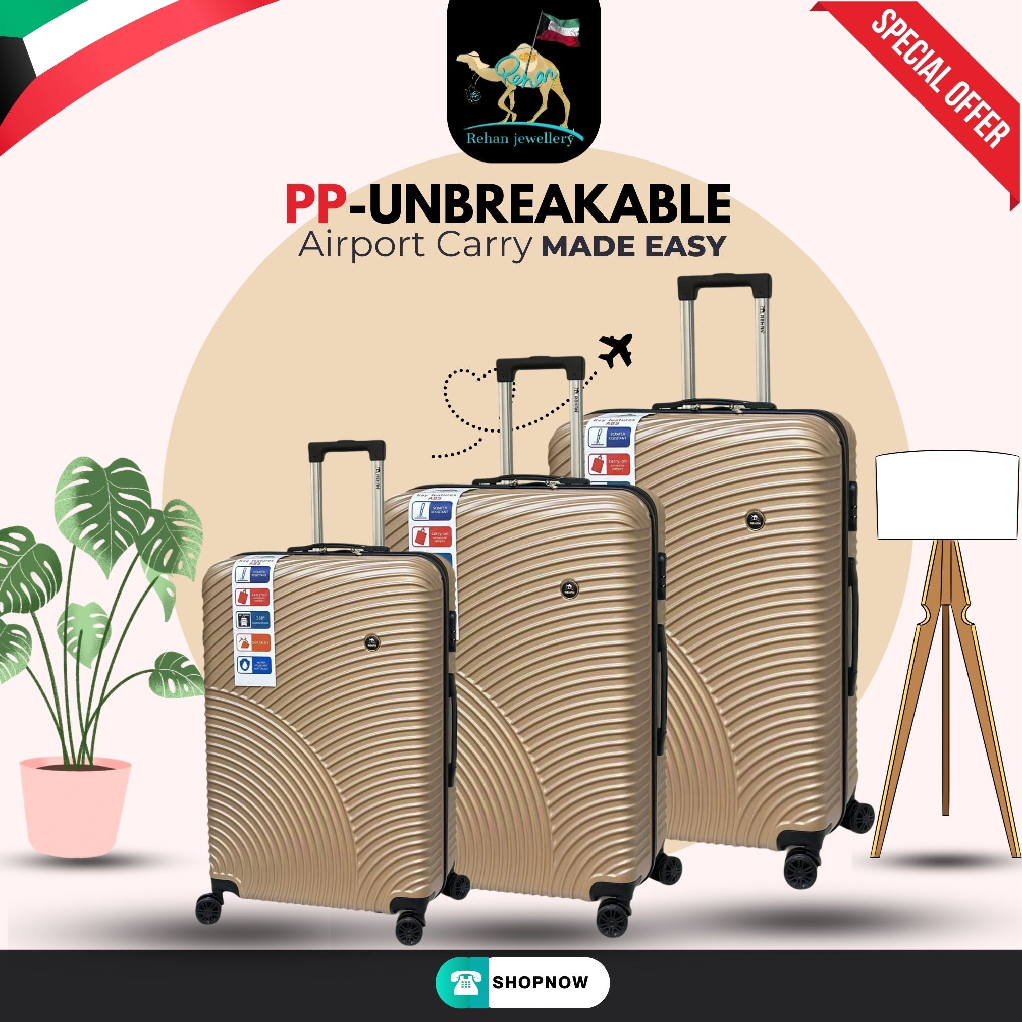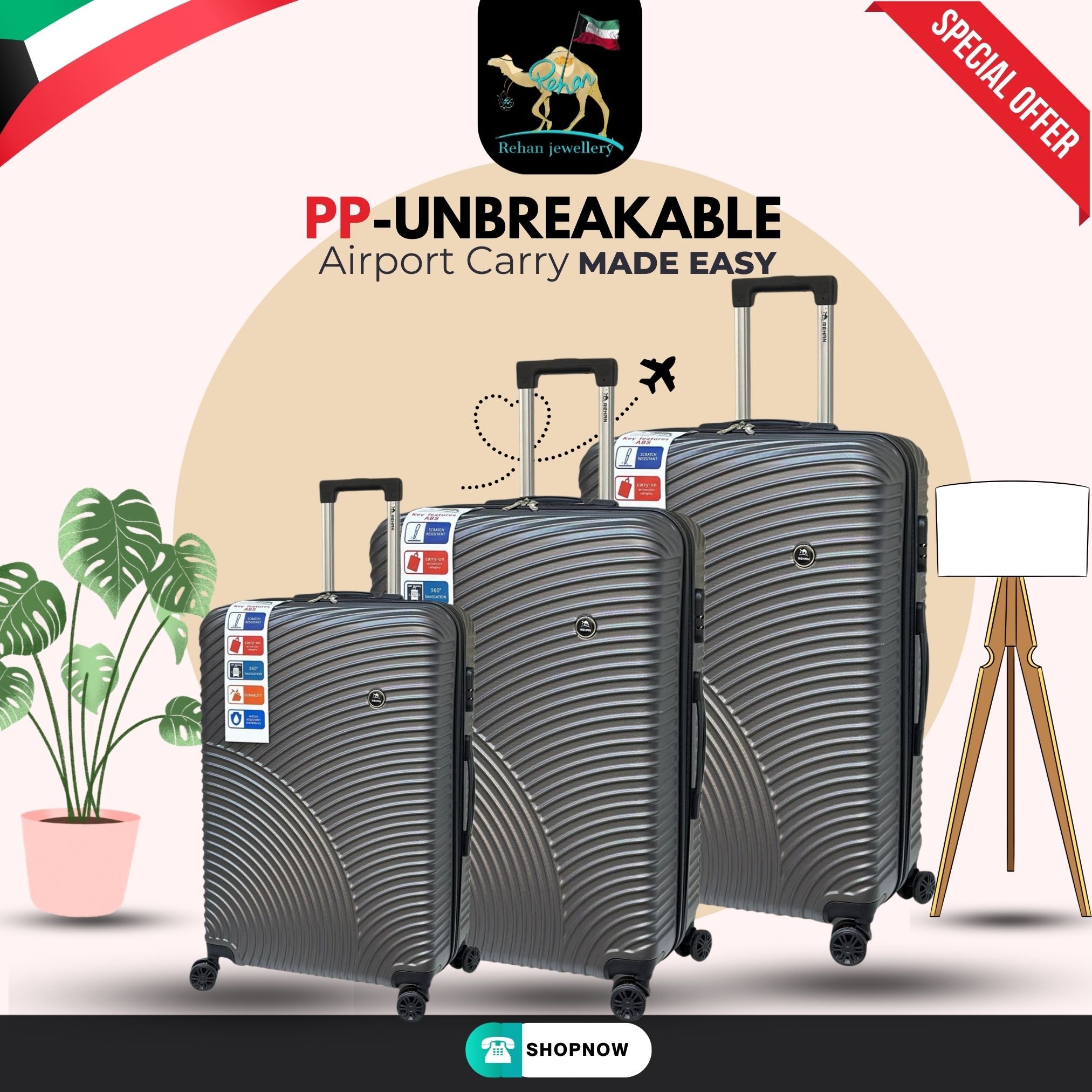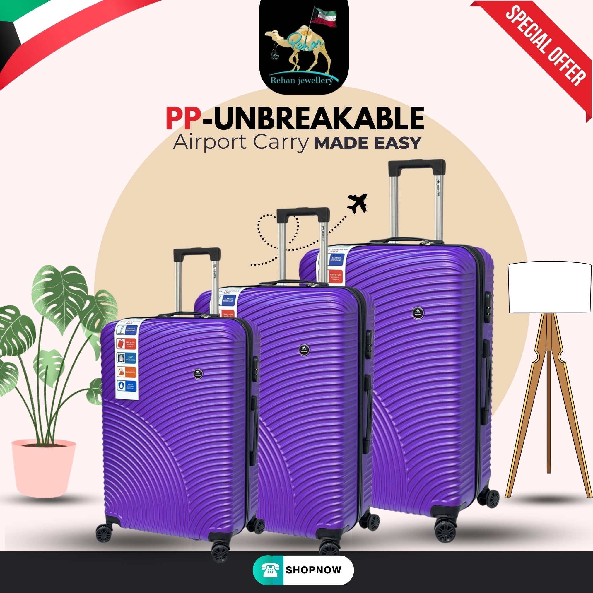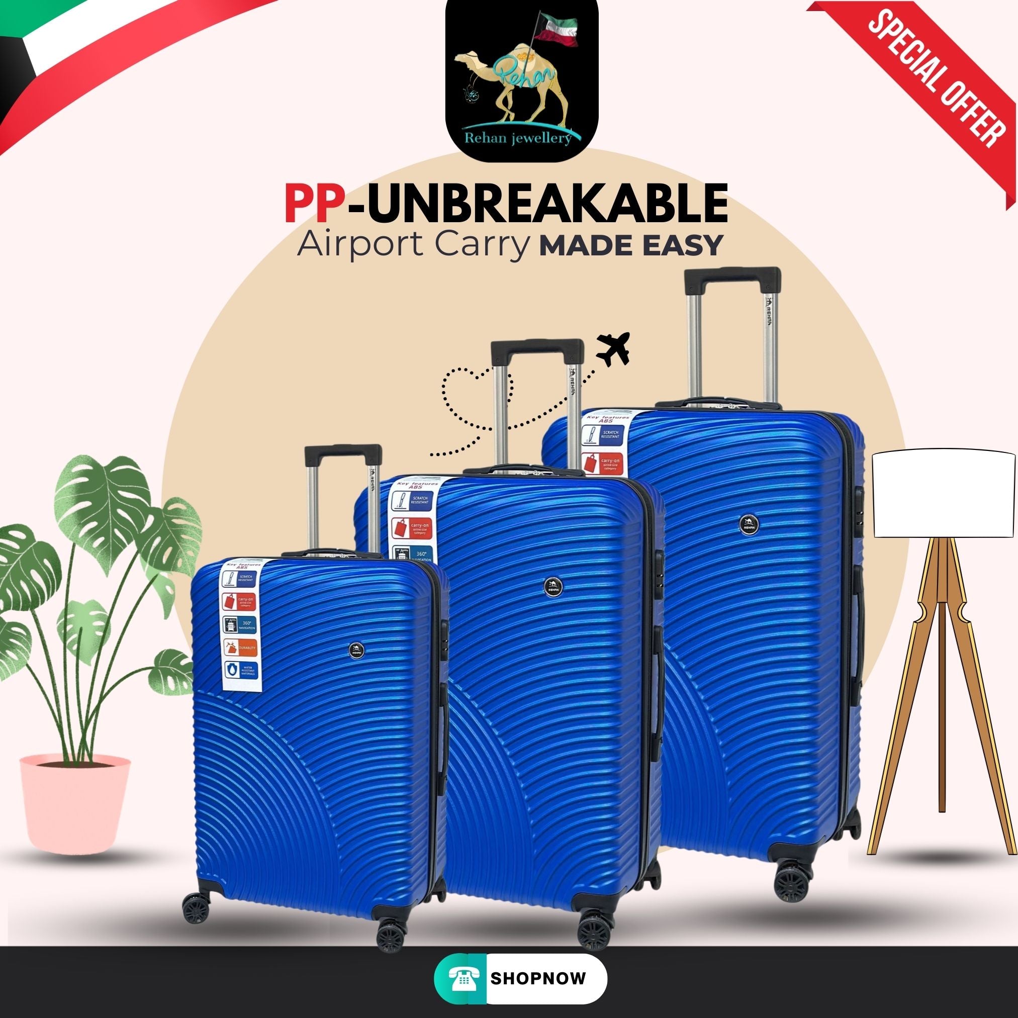 Travel smarter with our 3 Pcs PP Trolley Bag Set, built with an unbreakable polypropylene hard shell, 360° smooth spinner wheels, and reinforced zippers for durability. Lightweight, stylish, and spacious – the perfect luggage set for business trips, vacations, and family travel in Kuwait.
