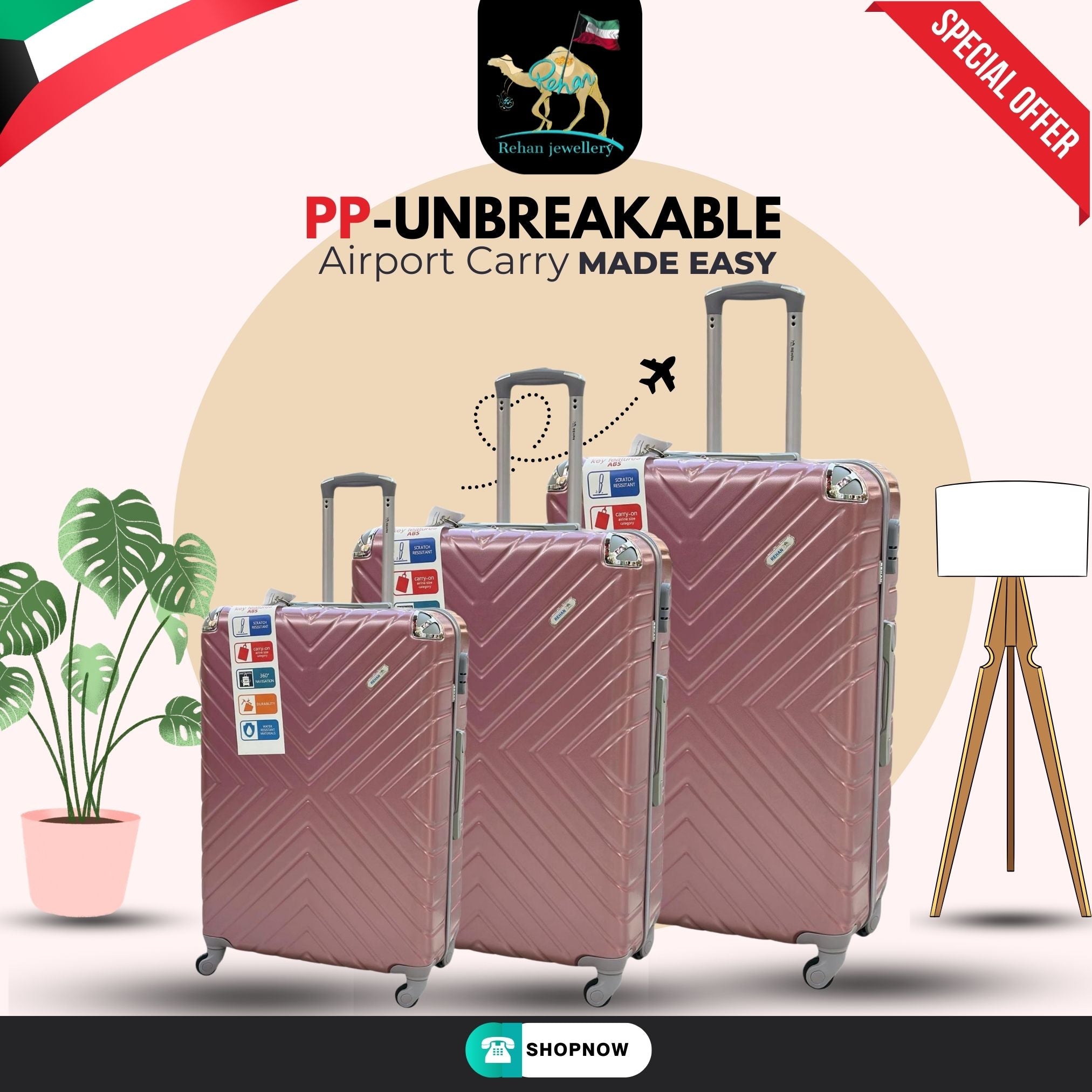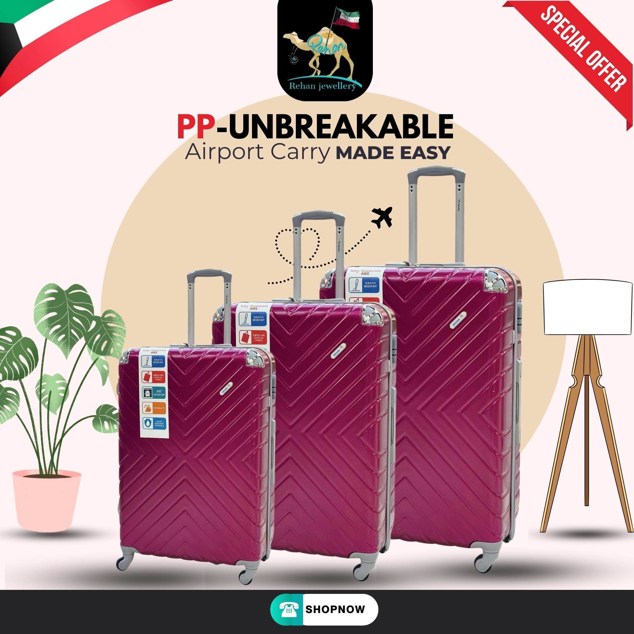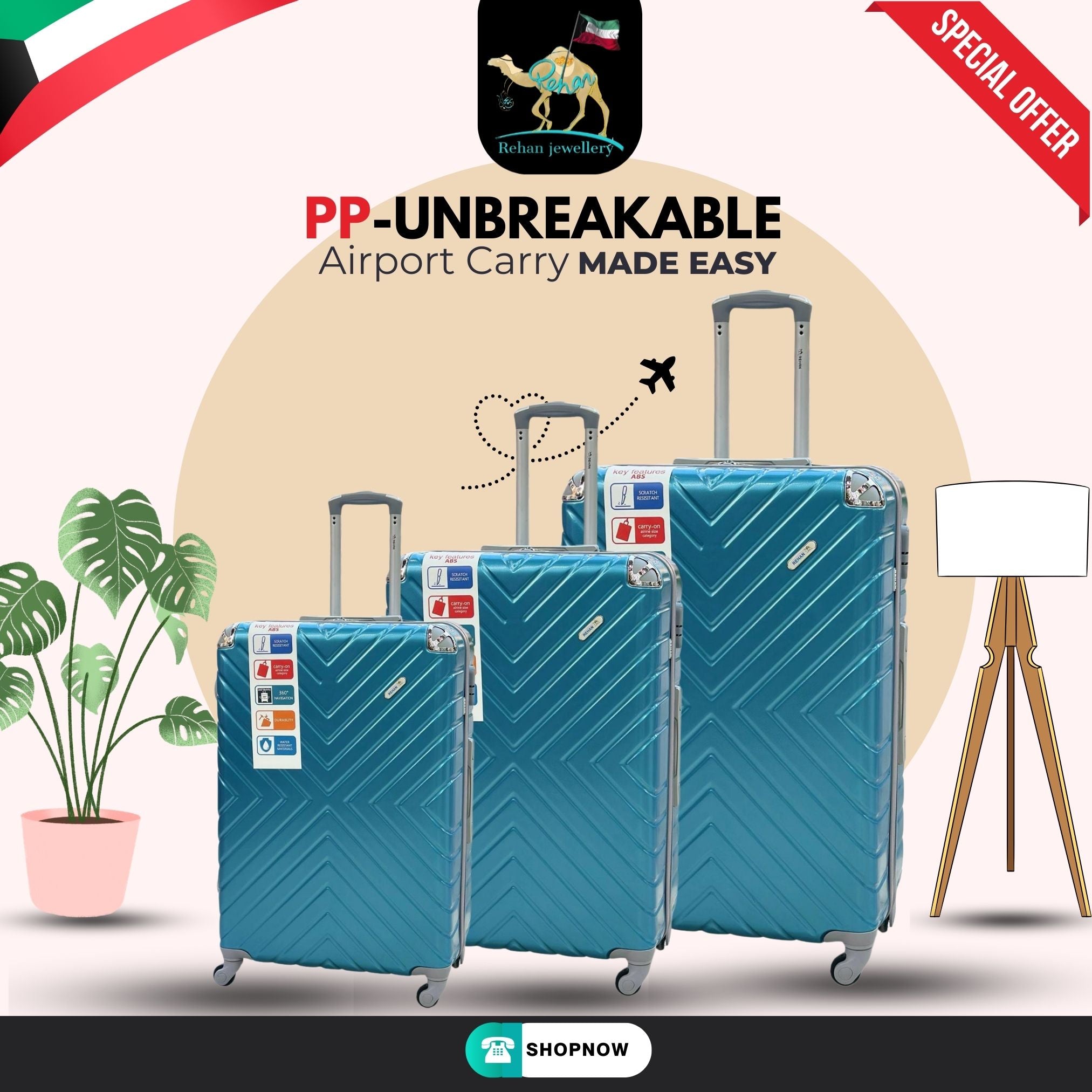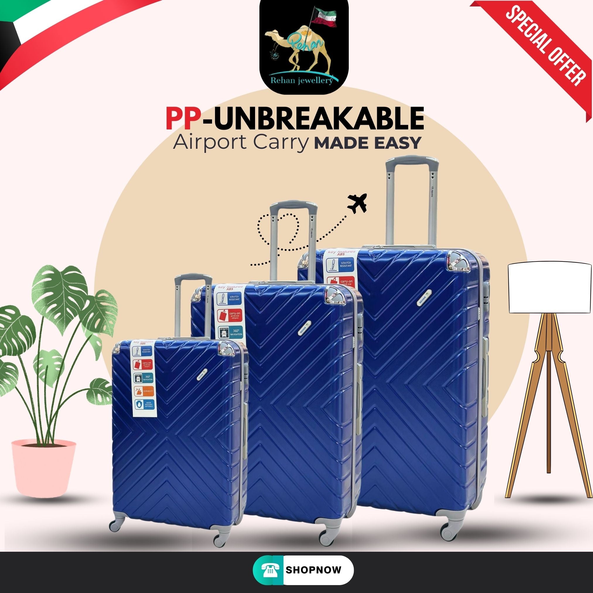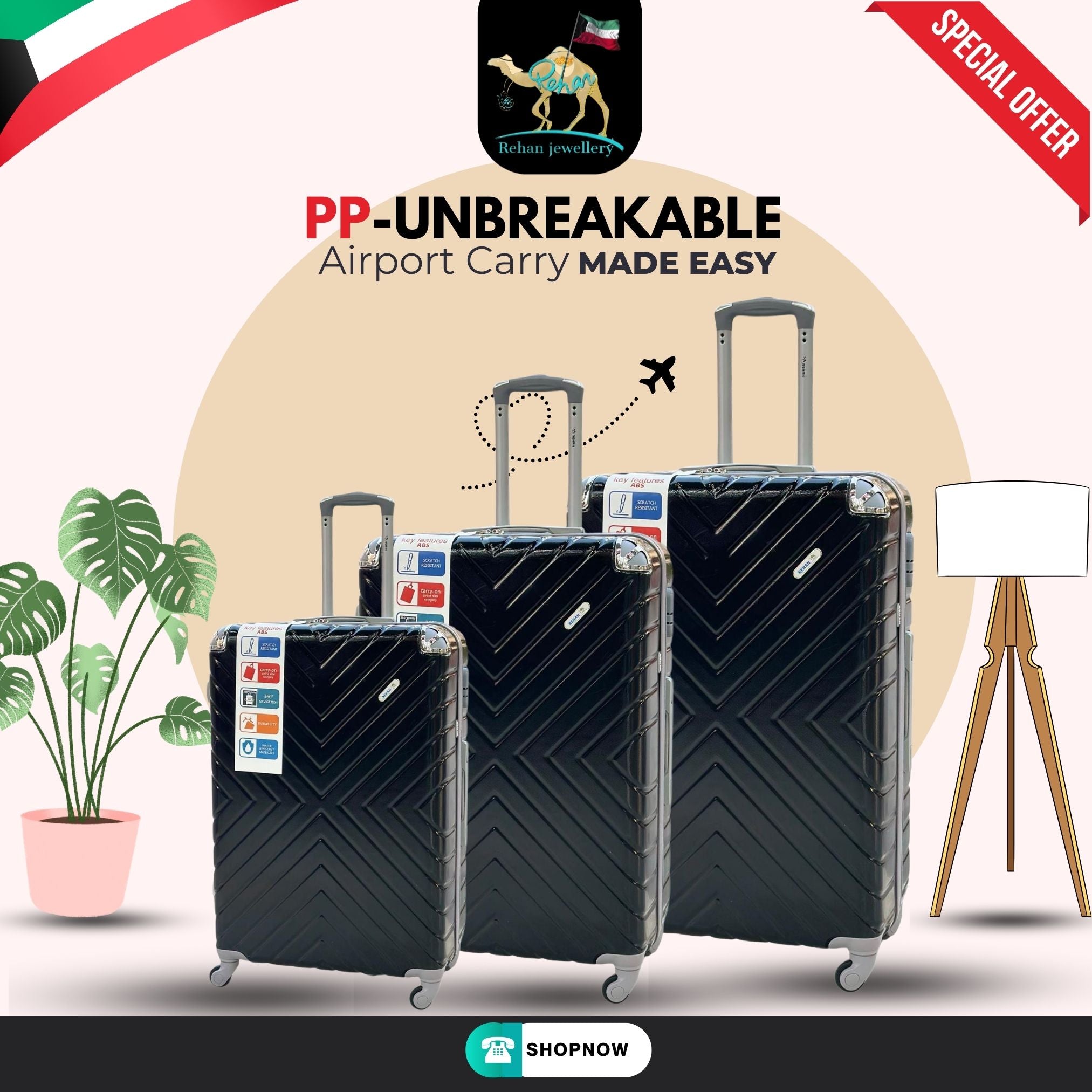 Travel smarter with our 3 Pcs PP Trolley Bag Set, built with an unbreakable polypropylene hard shell, 360° smooth spinner wheels, and reinforced zippers for durability. Lightweight, stylish, and spacious – the perfect luggage set for business trips, vacations, and family travel in Kuwait.