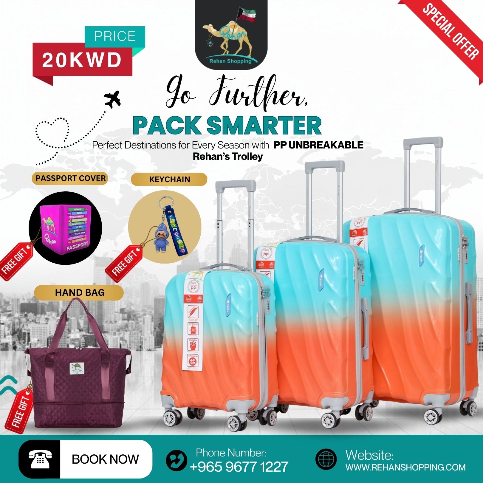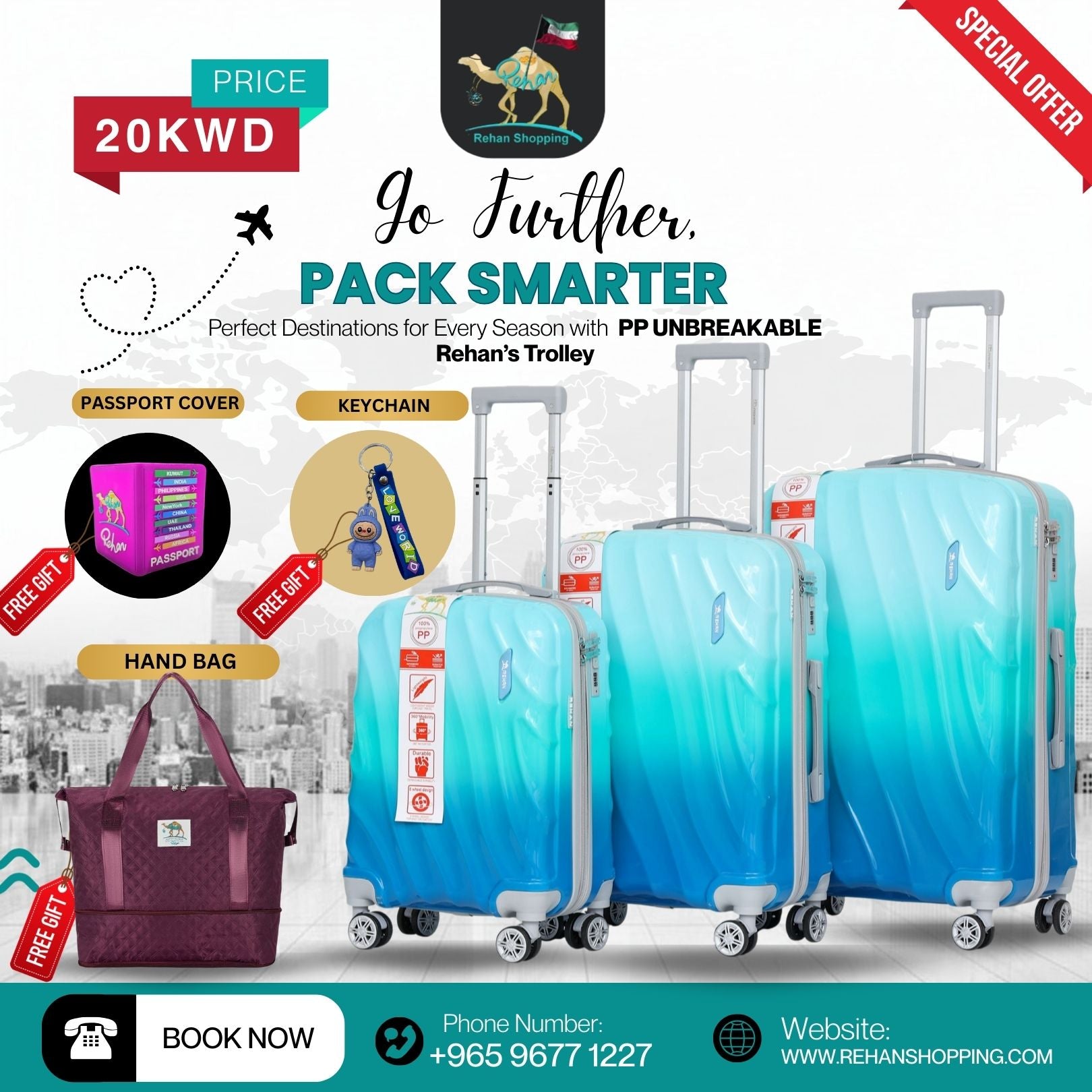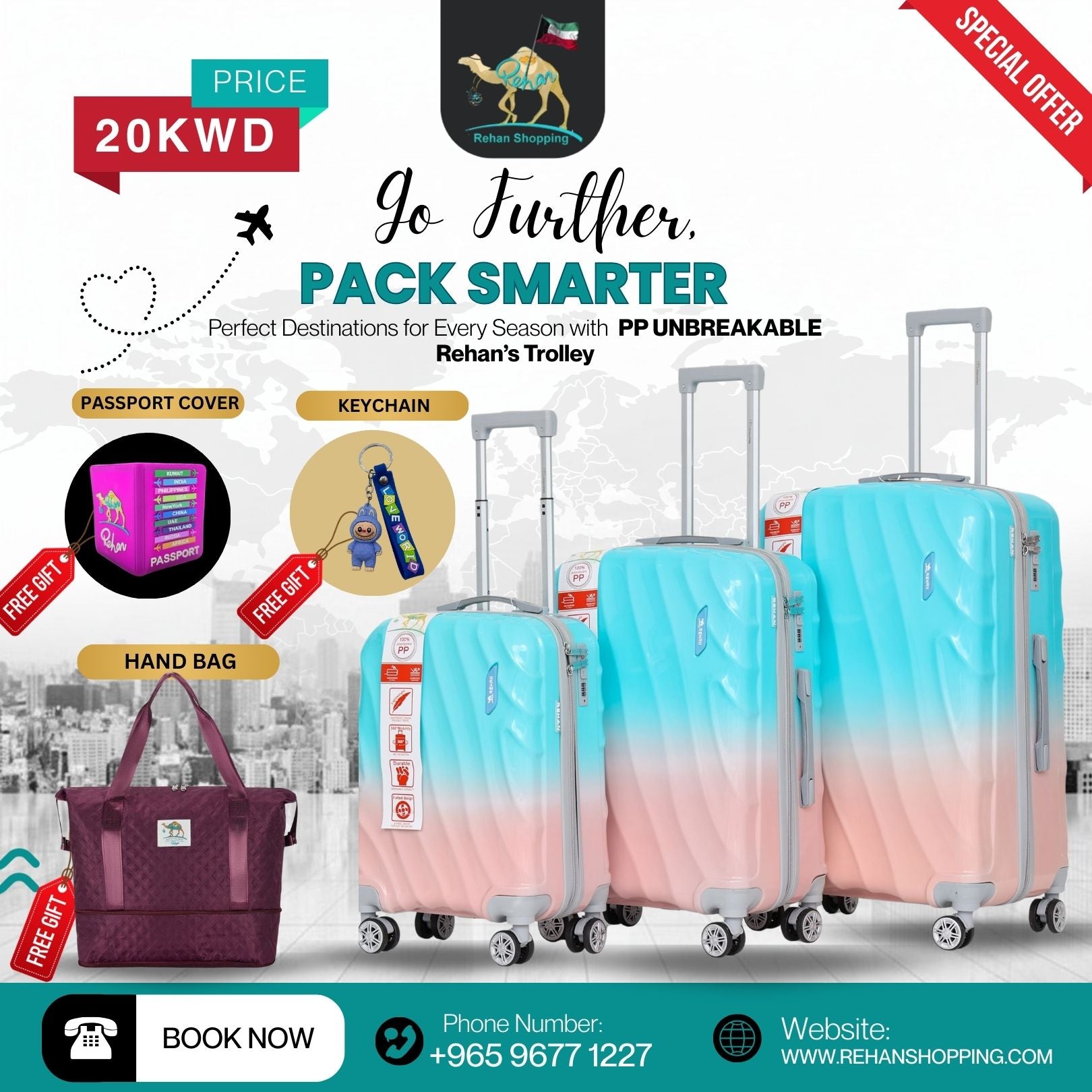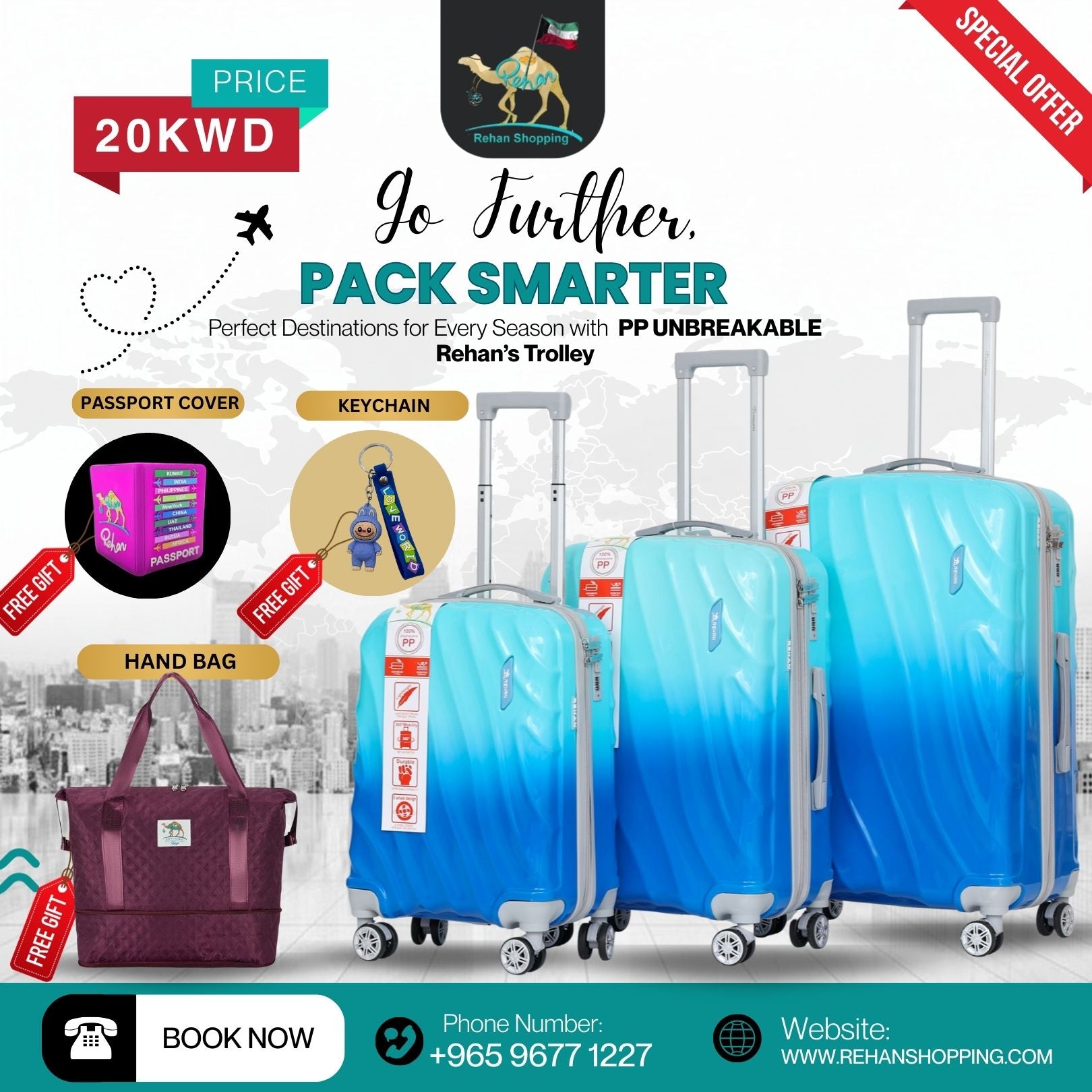 Travel in style and confidence with our 3 Pcs ABS Unbreakable Trolley Luggage Set, available now at RehanShopping Kuwait. Designed with durable ABS hard shell material, this set is built to withstand every journey while keeping your belongings safe and organized.