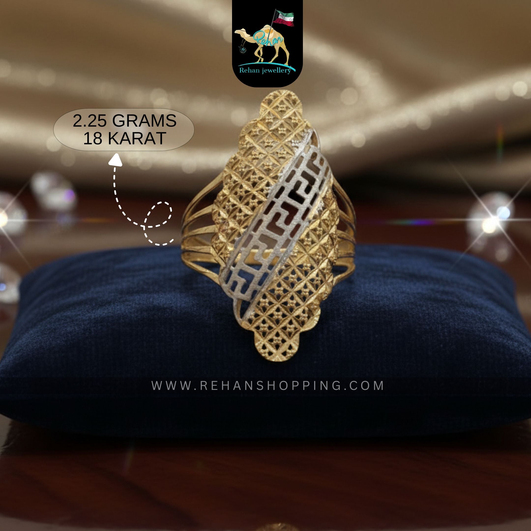 Showcase your royal elegance with this 18K Gold Dual-Tone Statement Ring, weighing 2.25 grams. The ring features a stunning white and yellow gold contrast with intricate lattice filigree craftsmanship — a timeless design that perfectly blends luxury and tradition.