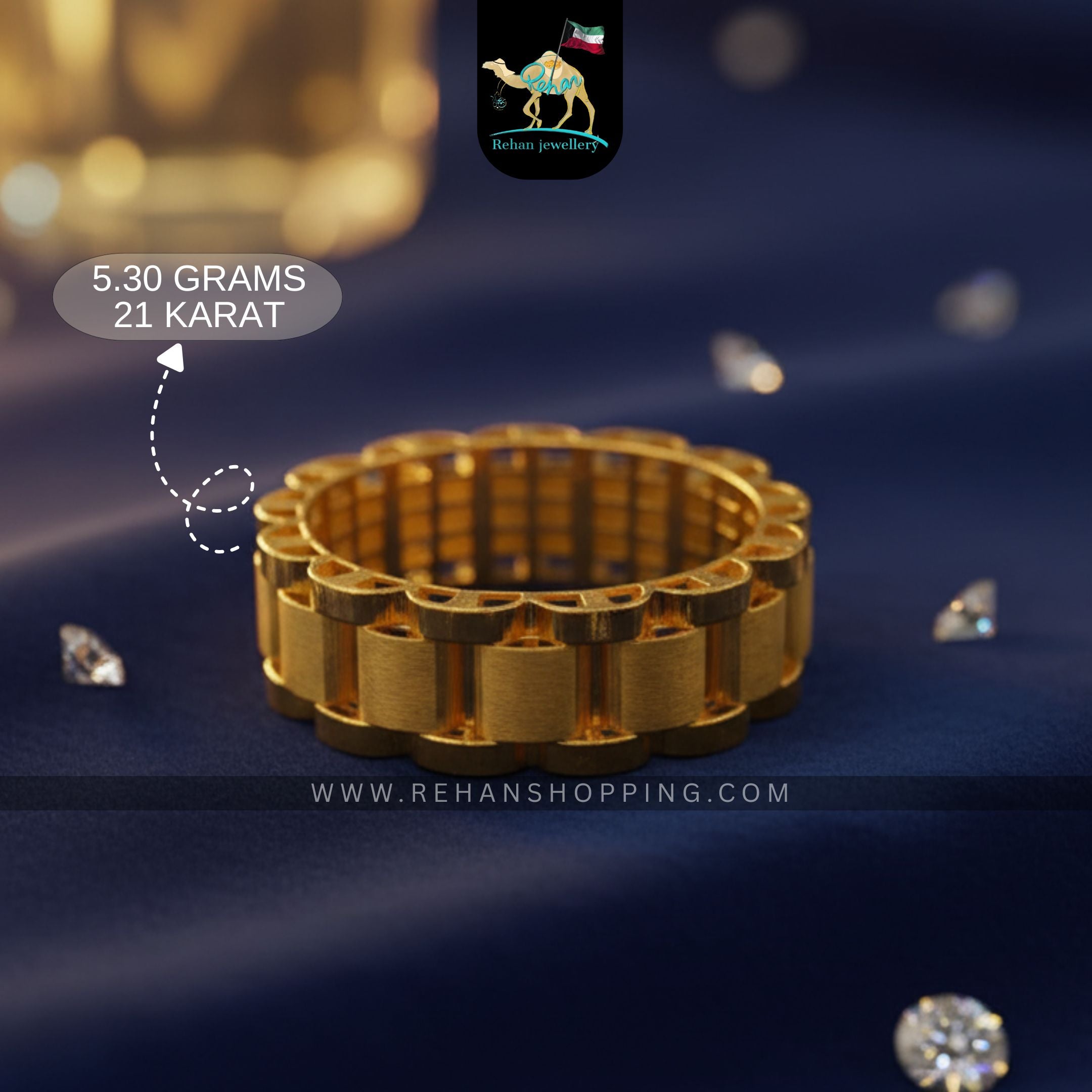Make a lasting impression with this 21K Gold Bold Chain Band Ring, weighing 5.30 grams. Crafted with precision, its unique link-inspired design reflects strength, luxury, and modern sophistication. This handcrafted solid gold ring by Rehan Jewellery combines timeless artistry with contemporary elegance — perfect for everyday wear or grand occasions.
