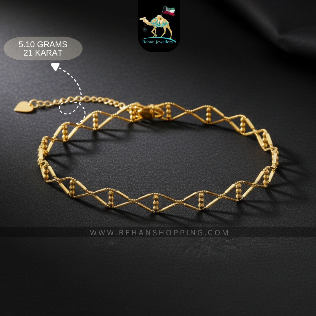 Embrace timeless elegance with this 21 Karat Gold Delicate Geometric Bracelet, weighing 5.10 grams. Designed with fine interconnected diamond-shaped links, this bracelet offers a lightweight yet luxurious look, perfect for both daily wear and special occasions.