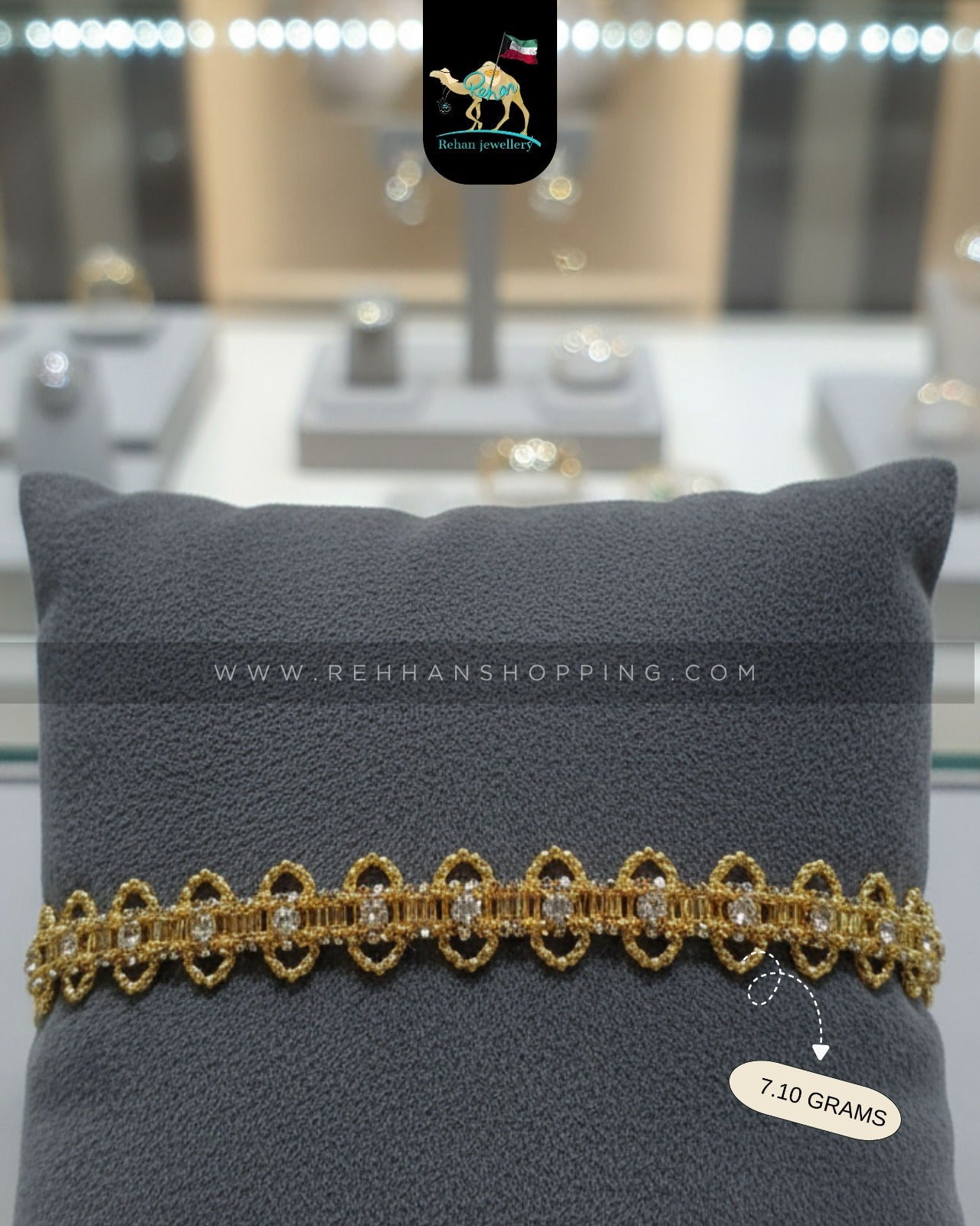 Elevate your jewellery collection with this 18 Karat Gold Diamond-Cut Bracelet from Rehan Jewellery. Weighing 7.10 grams, this exquisite bracelet features an elegant looped pattern accented with shimmering diamond-cut detailing, offering a perfect balance of sophistication and style. Ideal for weddings, festive occasions, or everyday luxury, it’s a timeless treasure designed for modern elegance.