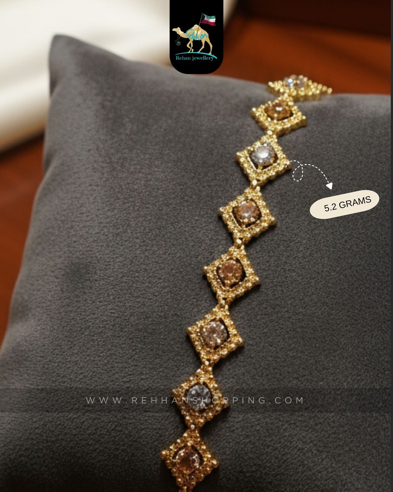 Elevate your jewellery collection with this 18 Karat Gold Diamond-Shape Stone Bracelet from Rehan Jewellery. Weighing 5.20 grams, this bracelet features elegant square diamond-shaped frames adorned with sparkling stone accents, creating a refined and luxurious design. Perfect for weddings, festive occasions, or everyday elegance, this piece adds timeless charm to any look.