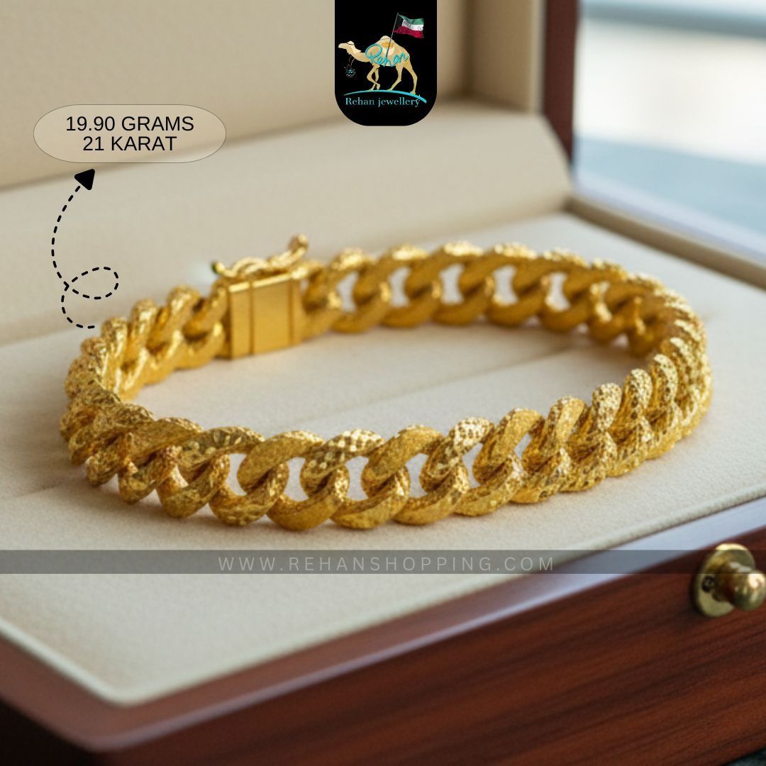 Make a bold statement with this 21 Karat Gold Cuban Link Bracelet from Rehan Jewellery. Weighing 19.90 grams, this bracelet showcases a luxurious and durable Cuban link design, perfect for men and women who love powerful and stylish gold jewellery. Its intricate texture and polished finish highlight premium craftsmanship, ensuring it stands out on every occasion.