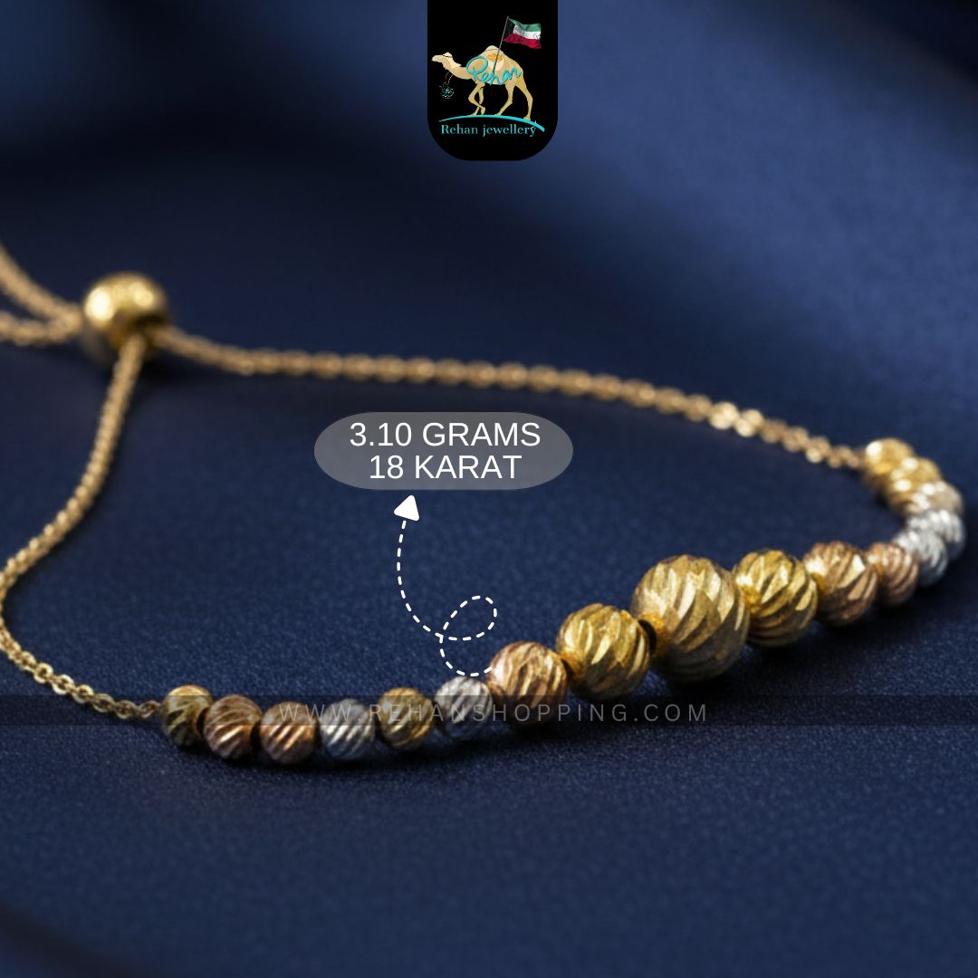 Add a touch of elegance to your everyday style with this stunning 18K Gold Beaded Adjustable Bracelet, weighing 3.10 grams. Designed with a sequence of multi-tone textured gold beads in yellow, white, and rose gold finish, this bracelet is both versatile and fashionable. The adjustable clasp ensures a perfect fit for any wrist, making it an ideal accessory for daily wear or gifting.