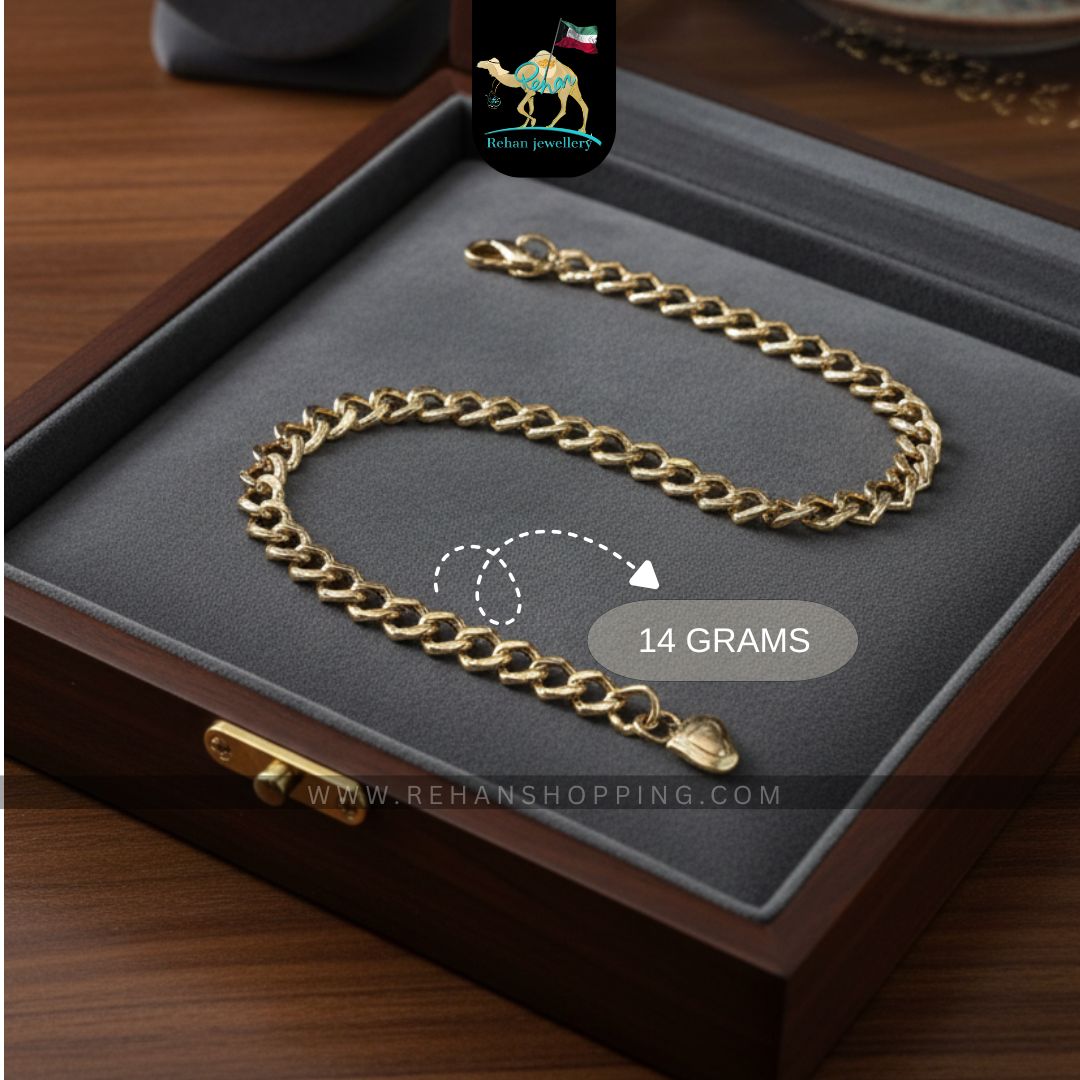 Discover elegance and luxury with this 21 Karat Gold Chain Bracelet weighing 14 grams, exclusively at Rehan Jewellery Kuwait. Designed with a timeless chain pattern, this bracelet is perfect for both everyday wear and special occasions. Crafted with precision and authentic 21K gold, it’s a classic addition to your jewellery collection.