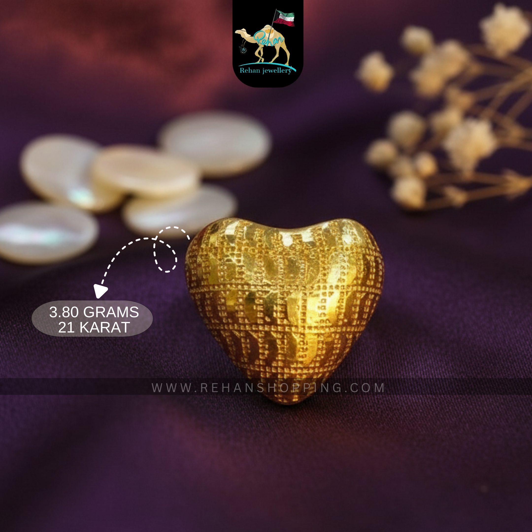 Celebrate love and elegance with this 21 Karat Gold Heart Statement Ring from Rehan Jewellery. Weighing 3.80 grams, this bold heart-shaped design features intricate detailing that adds depth and brilliance to your style. Perfect as a symbol of love, it makes an ideal gift or a standout addition to your personal jewellery collection. Lightweight yet luxurious, this ring is perfect for both everyday wear and special occasions.
