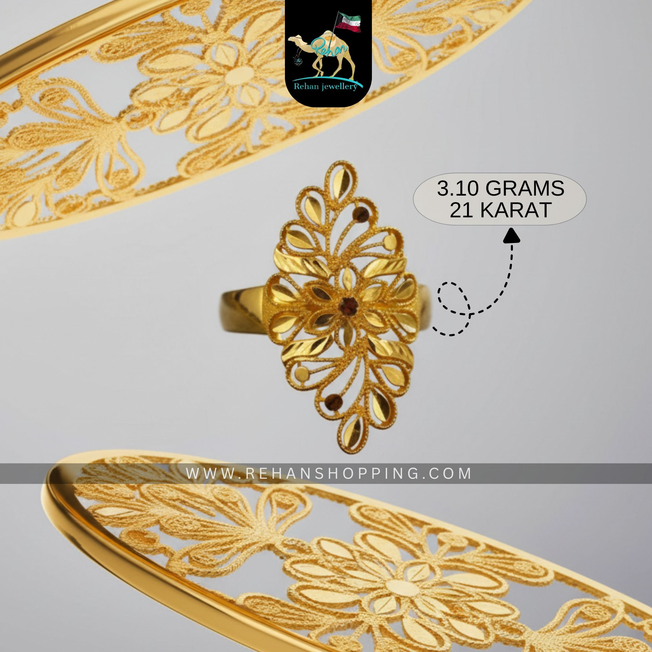Experience timeless craftsmanship with this 21K Gold Floral Filigree Ring, weighing 3.10 grams. Its delicate floral pattern and airy filigree detailing reflect elegance and artistry in every curve. Handcrafted for a luxurious yet lightweight feel, this ring is perfect for both daily wear and special celebrations.