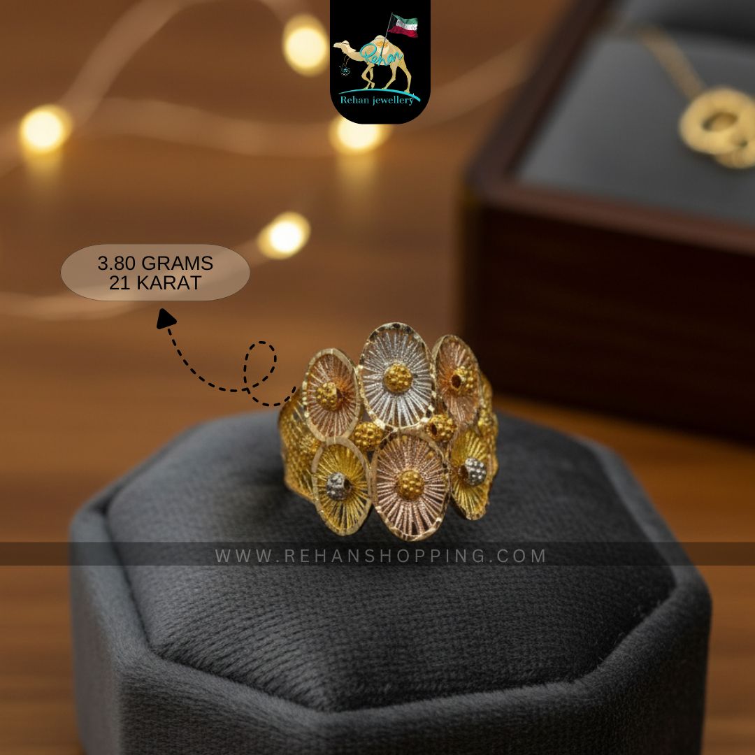 Elevate your elegance with this 21 Karat Gold Floral Multi-Tone Ring from Rehan Jewellery. Weighing 3.80 grams, this stunning ring showcases a radiant floral-inspired design with intricate detailing in yellow, rose, and white gold tones. Its textured finish and unique craftsmanship make it a timeless statement piece for any jewellery collection.